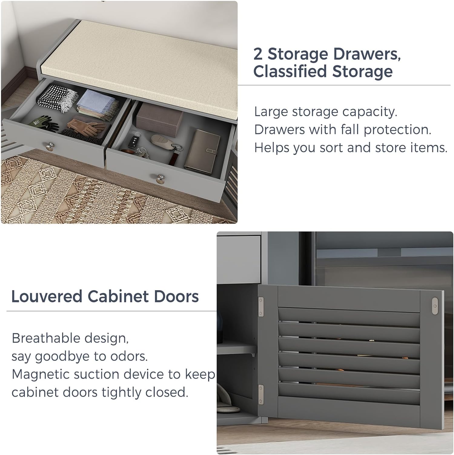 - Modern Storage Bench for Any Scene -- A neutral color matching plus louvered design door will add stylish look to your home. Breathable Cabinet Doors, cushion seating and storage in one feature is very suitable to as a shoe bench for entryway, a storage bench for closet room, or a storage chest in end-of-bed.