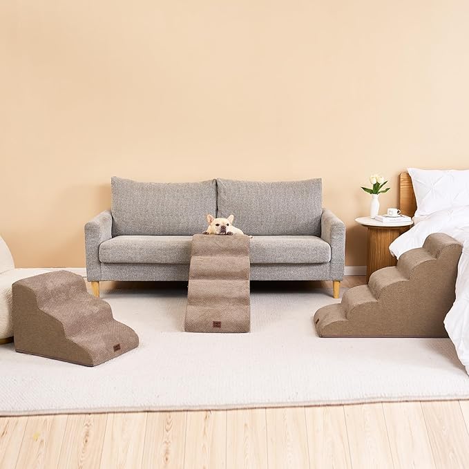- SPECIFIC AND STEADY DESIGN - 33D density of pure foam make this stair more steady when your pets walk on. The dog bed stairs can provide strong support for pets in the walking process. Low angle slope design can better protect your pet's joints.