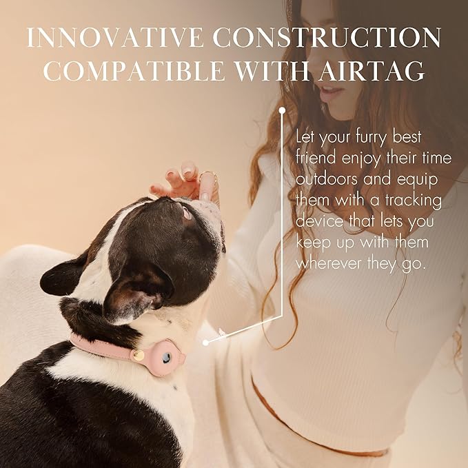 - WITH A DOG TRACKING DEVICE HOLDER: Nina Woof Cupertino Dog Collar is a good choice for pet owners who like using pet tracking devices. This vegan leather dog collar is Apple AirTag 2021-compatible. Equipping your pet with a tracking device can make you feel at ease by letting you know where your beloved animal is