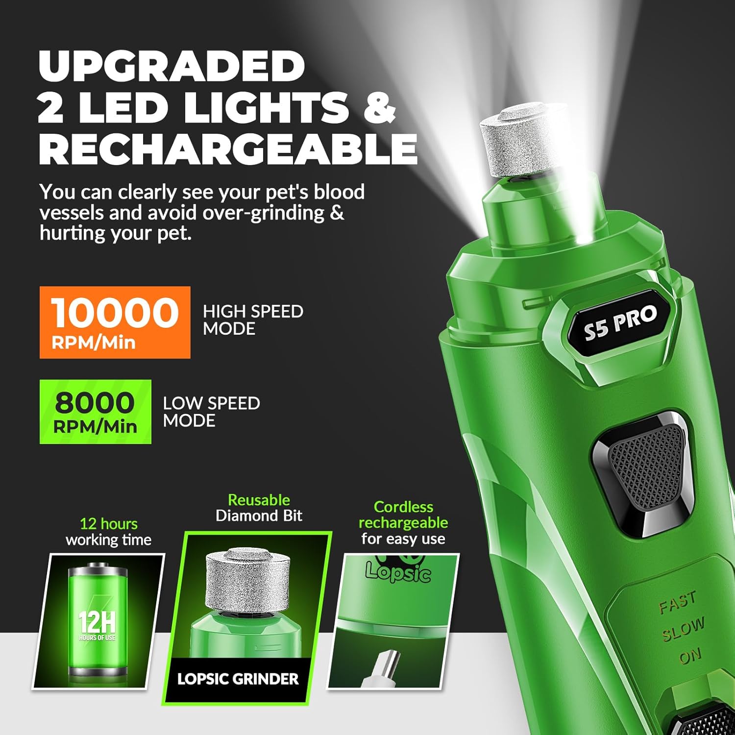 • 【Improved Precision: 2 LED Lights & Adjustable Speeds】: LOPSIC dog nail grinder for dogs features 2 LED lights that offer clear visibility of the quick, ensuring precise and safe nail trimming for your pets. The adjustable speeds(8,000 RPM to 10,000 RPM) of dog nail trimmers can adapt to small, medium and large pets nail trimming needs. When using the dog nail trimmers at the proper speed, pet nails of different hardness can be efficiently ground