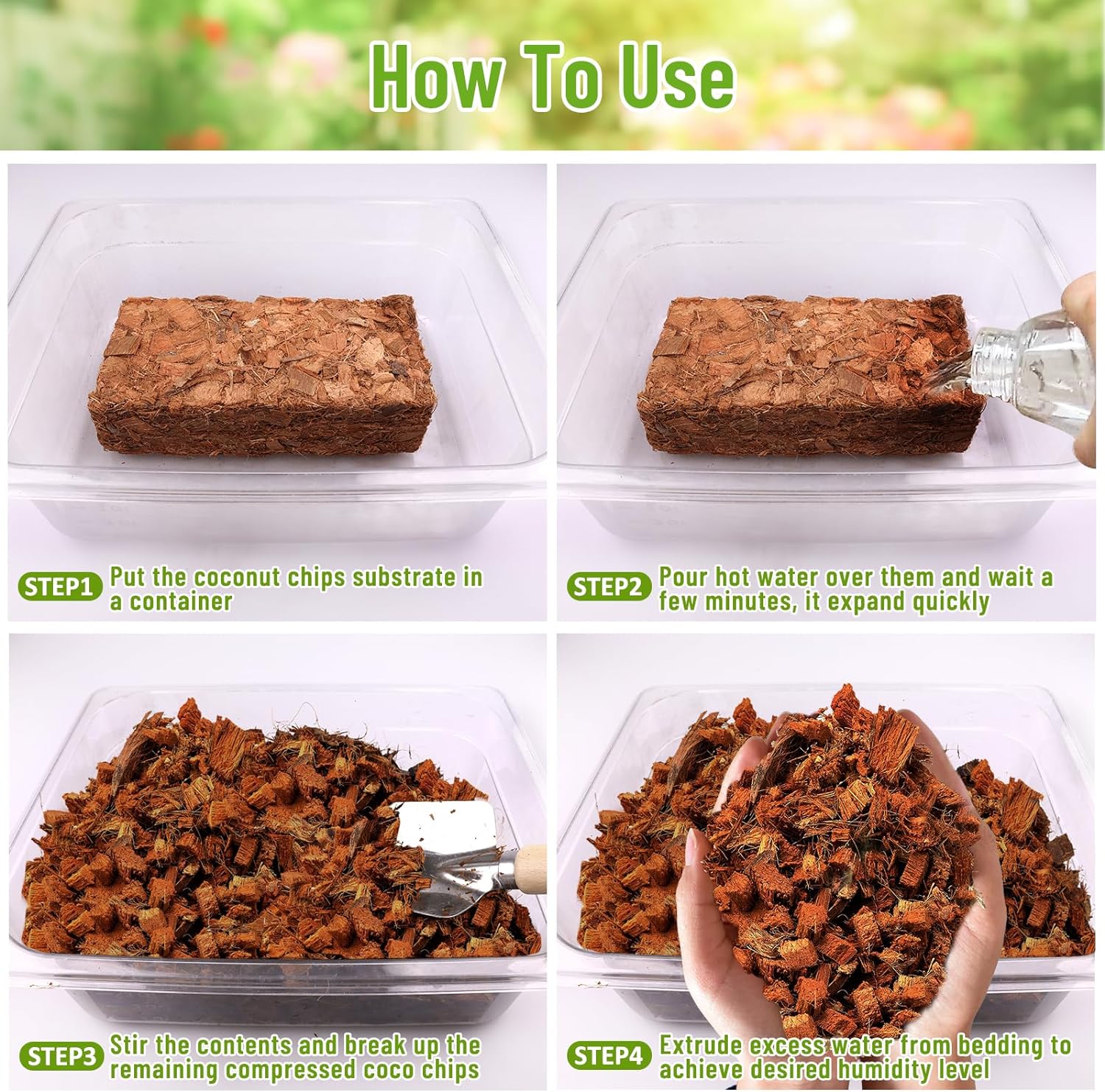 - Coconut Chip Substrate for Reptiles: You will get 2 pack reptile substrate, a premium substrate for reptiles and amphibians. Made of natural and organic coco husk chips with a soft, the texture is soft and natural, allowing them to burrow in and out of hiding, great for snake bedding; tortoise bedding; ball python bedding, providing a natural and cozy habitat for your pets