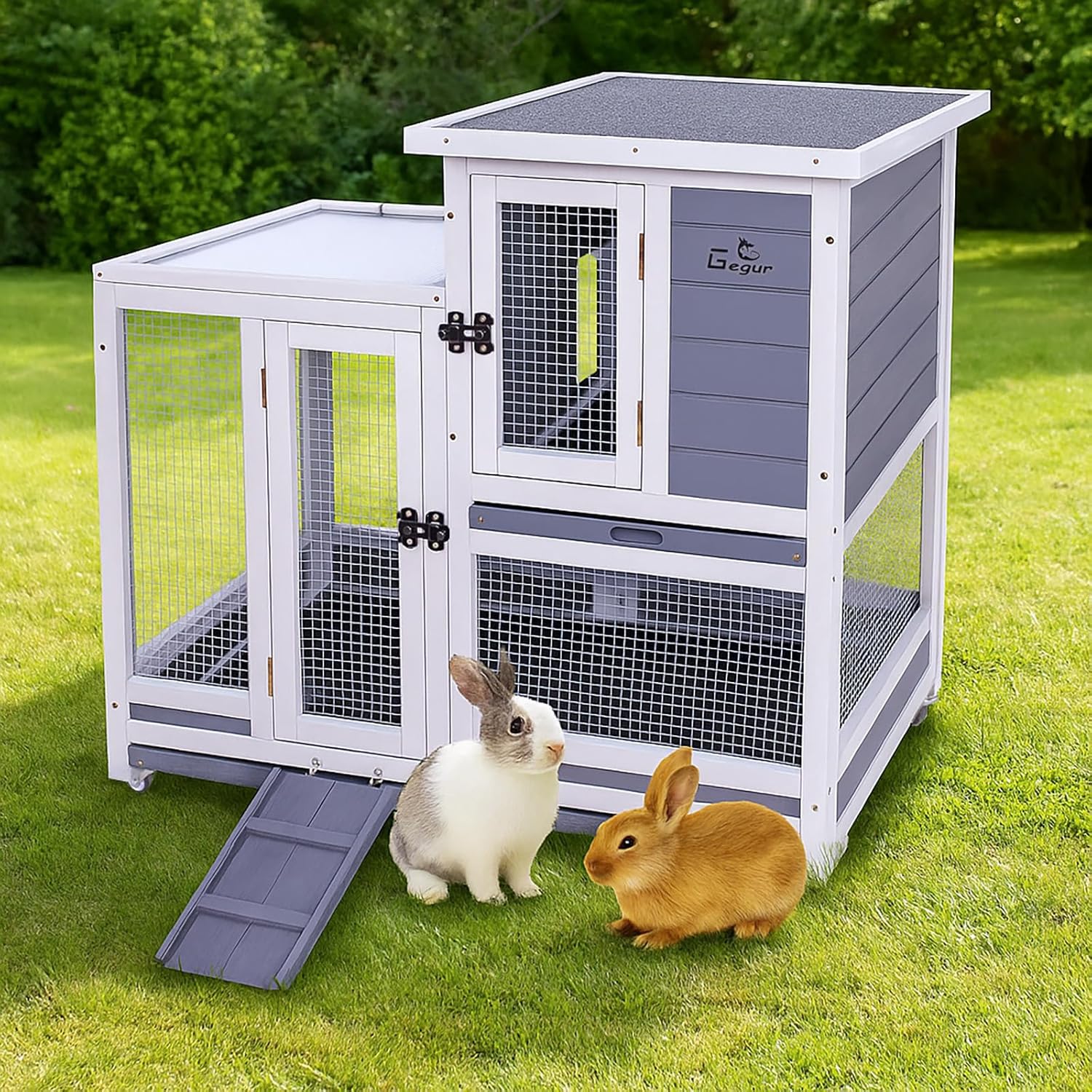 GEGURI Rabbit Hutch, Two-Story Indoor Bunny Cage, Outdoor Guinea Pig Cages for Small Animals with Wheels, Removable Tray