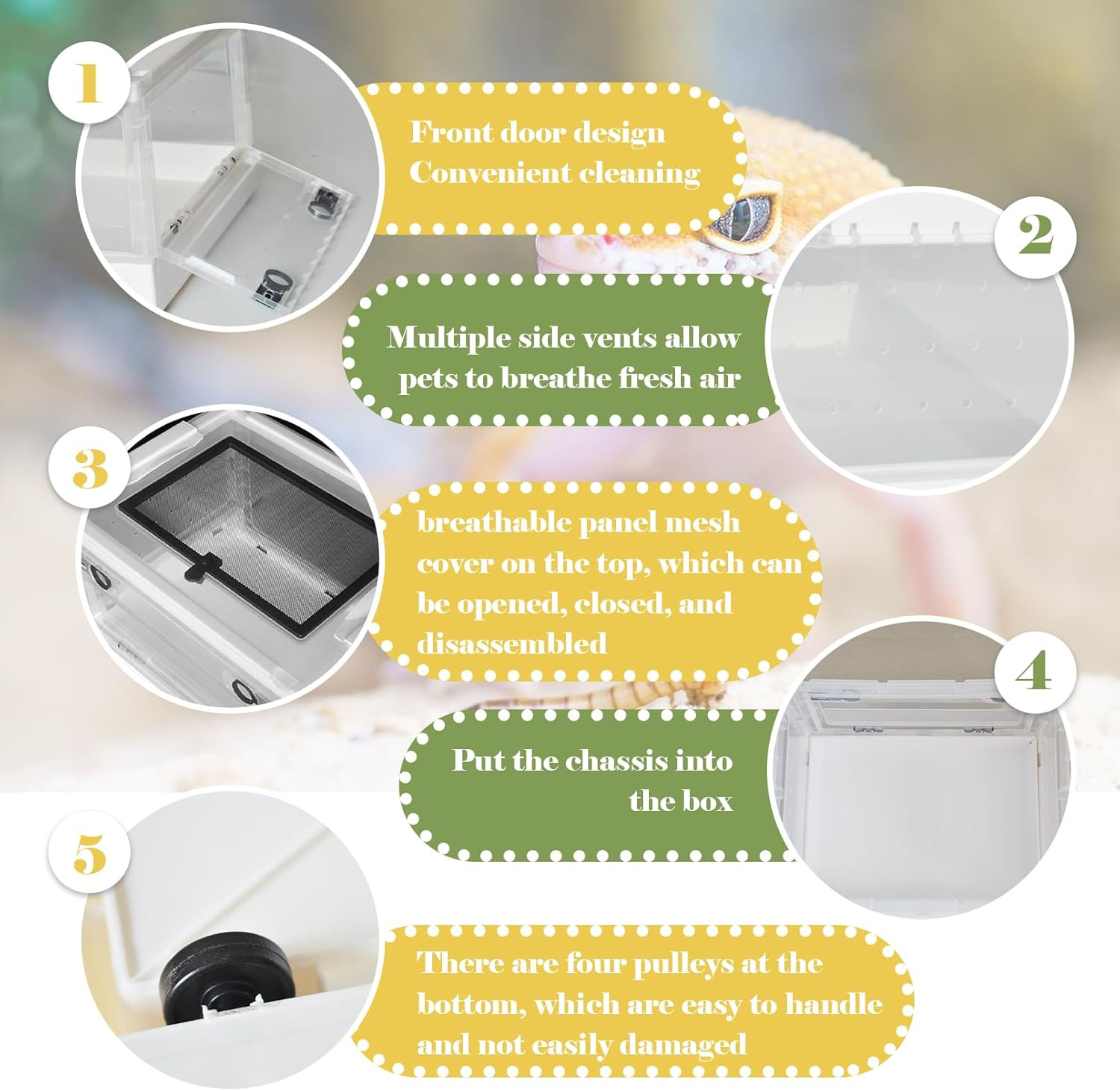- Clever Design:Portable small snake terrarium is designed with multiple small air holes for ventilation there is a breathable panel mesh cover on the top,can be opened,closed,and disassembled,ventilation and breathability,ensuring air circulation in the internal habitat,multiple vents at the bottom and sides allowing pets to breathe fresh air. front panel can be opened or closed,convenient cleaning of pet houses,four rolling pulleys at the bottom,carrying out, and not easily broken
