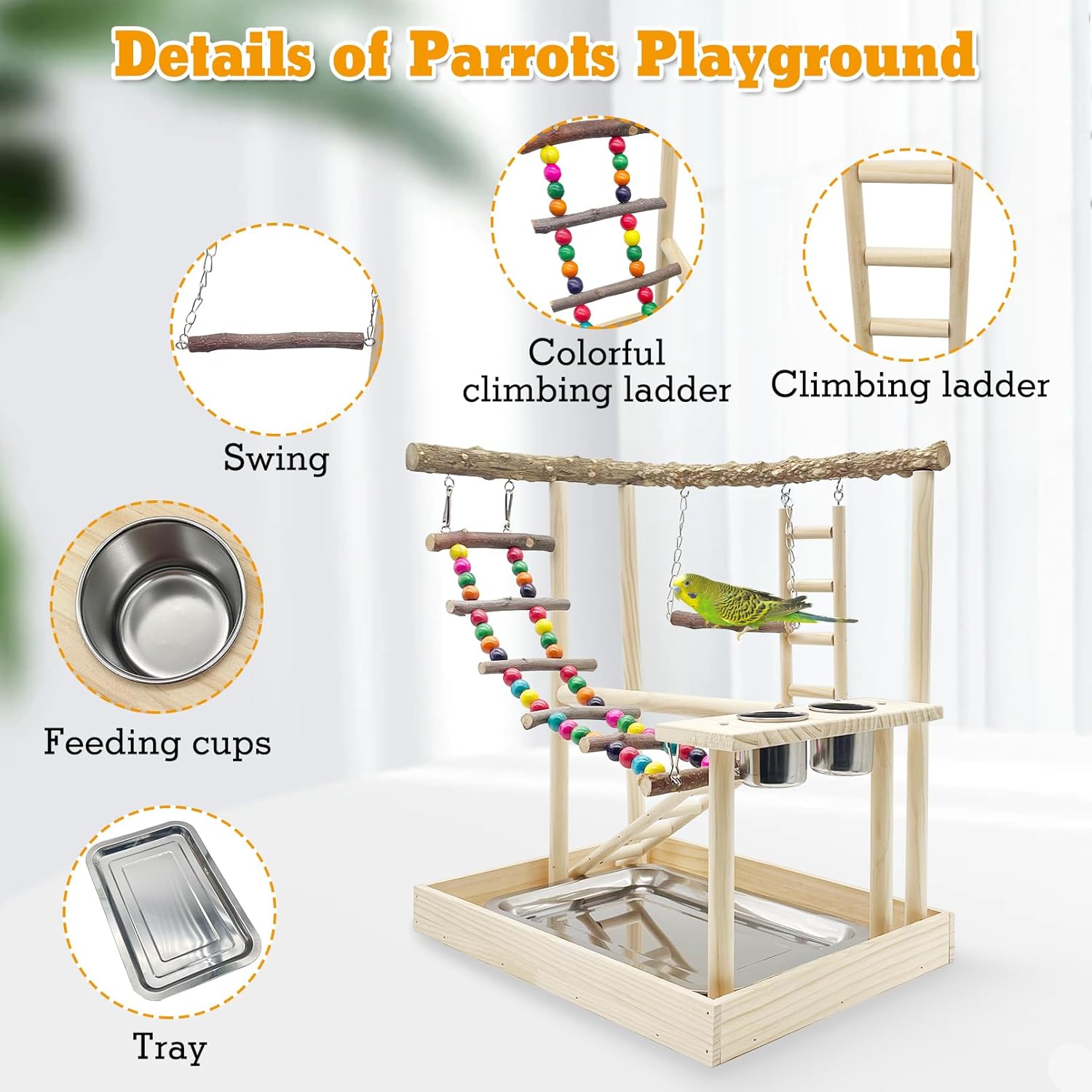 Hamiledyi Bird Playground Parrots Wood Perch Stand Cockatiel Playground Bird Play Gym Colours Climb Ladders Swing Chewing Toys with Parakeet Feeding Cups Exercise Activity Center for Lovebirds Conure