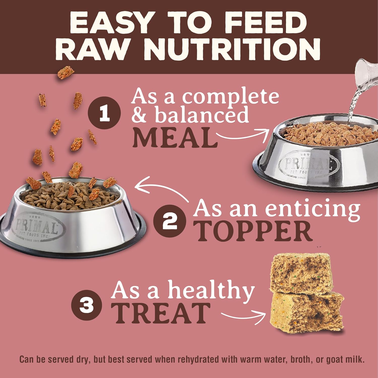- Serve as a complete & balanced meal, a freeze dried dog food topper or treat. Adding Primal Pet Food just a few times a week will help you start to see the results raw food for dogs can provide
