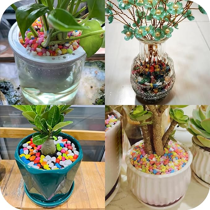 - Pea Gravel: This colored pebbles are naturally harvested, extremely high hardness, abrasion resistance, smooth and light, long-lasting beauty. The bright color will add vitality to your plant.