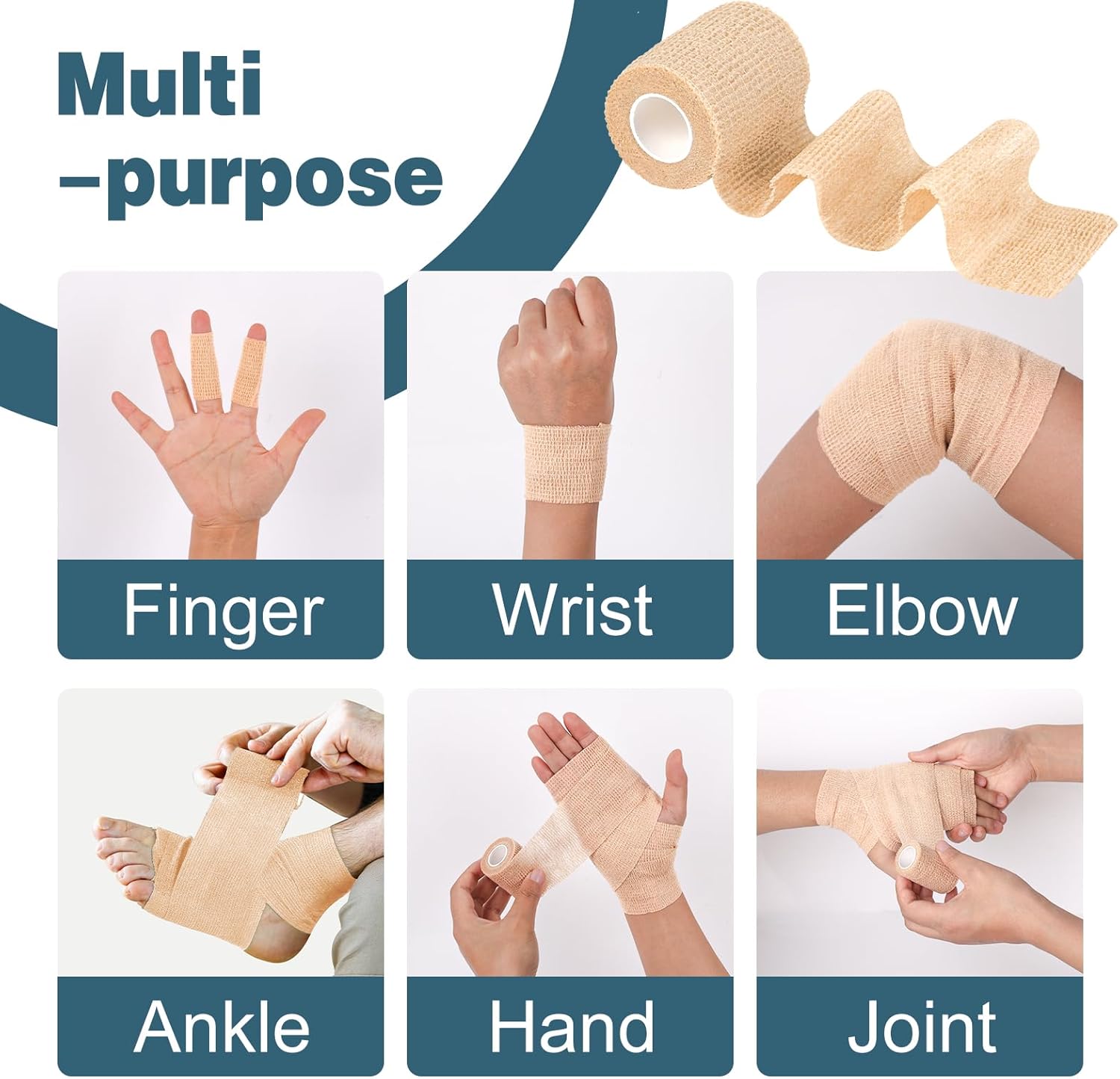 - Self Adhesive Bandage: Package includes 8 rolls of skin color self adhesive bandage wrap. Each roll measures 2 inch wide and 5 yards long after stretching. It easily adheres to itself but will not stick to other surfaces such as skin or hair, making it easy to pull off and change bandages