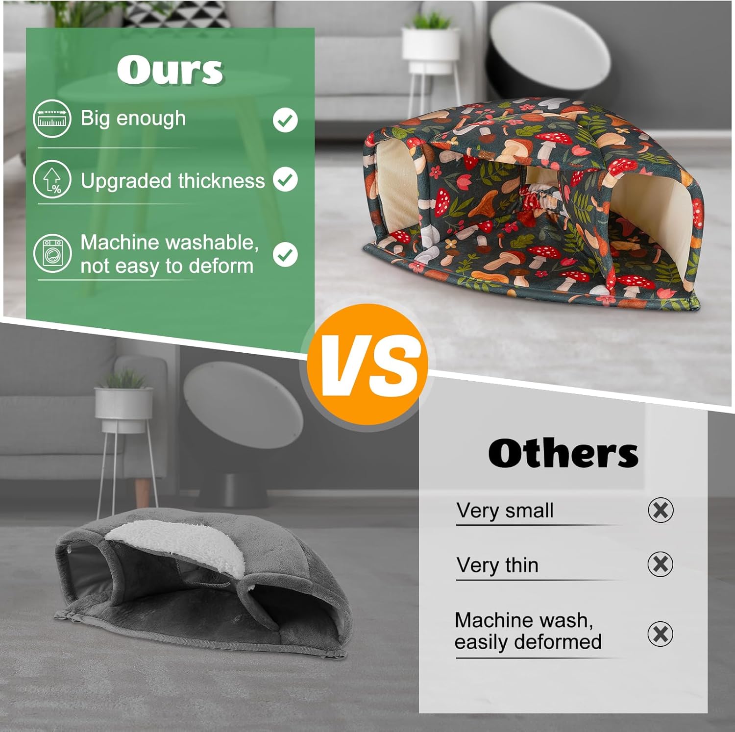 - Machine Washable: The guinea pig hideout is made of short plush and high-density elastic sponge; Not only is it very soft to the touch, but also more comfortable and warm, the fabric is thick enough to hold its shape and stay upright after many washes