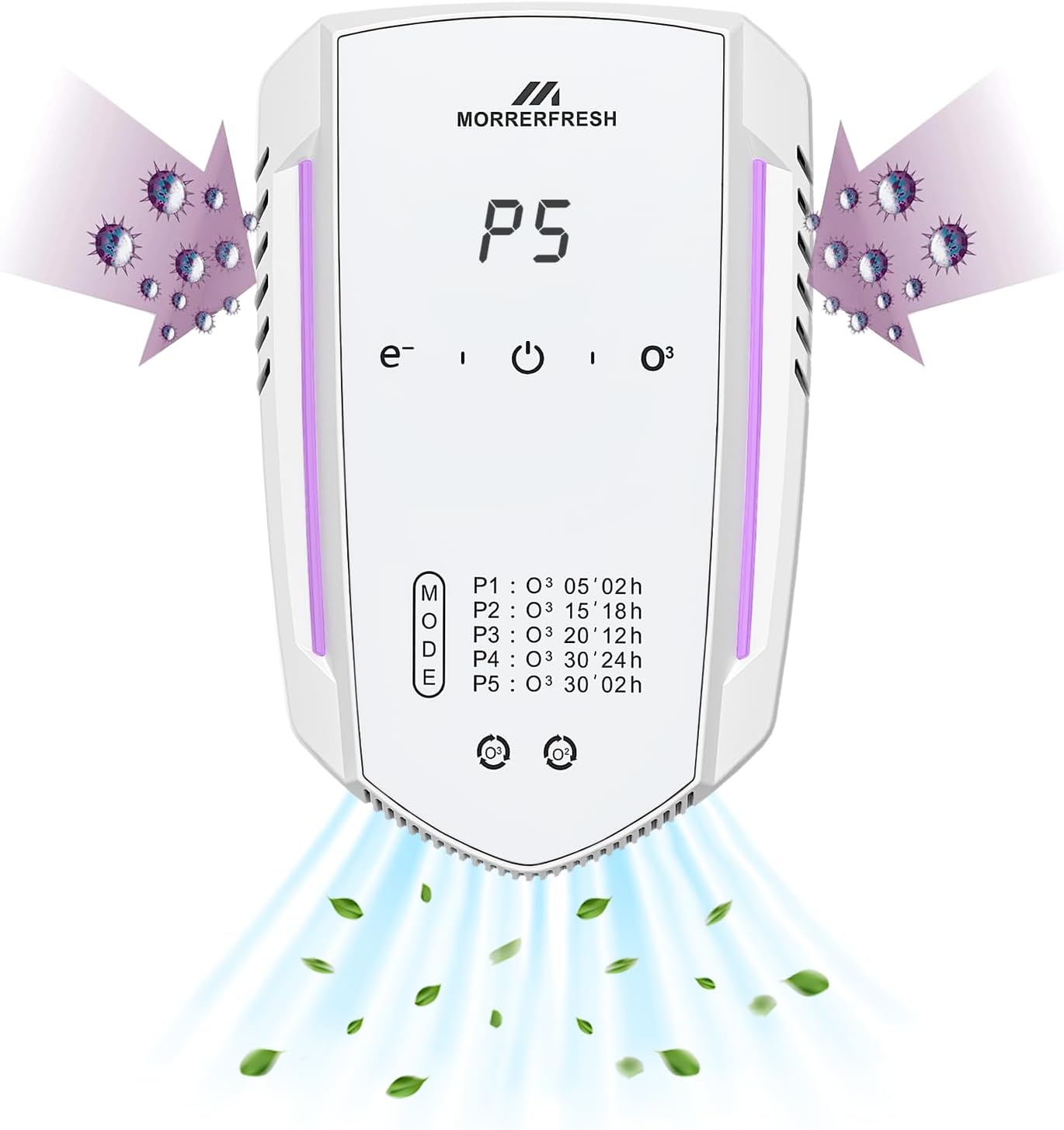 - 5 Adjustable Modes: P1: 5 min ozone, 2-hr pause (50–100 sq. ft.) │ P2: 15 min, 8-hr pause (100–150 sq. ft.) │ P3: 20 min, 12-hr pause (150–200 sq. ft.) │ P4: 30 min, 24-hr pause (200–250 sq. ft.) │ P5: 30 min, 2-hr pause (over 250 sq. ft. or for rapid deodorizing). Tip: If new odors appear during pauses (e.g., cat litter odor), use P5 for the shortest pause time