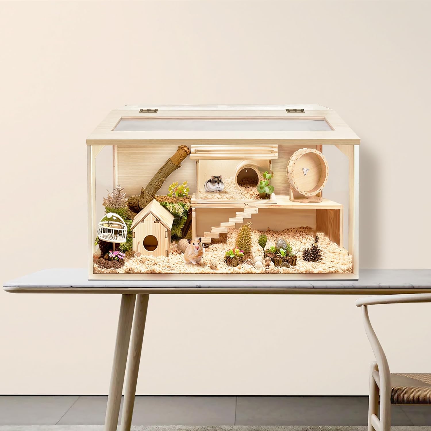- 【Premium Craftsmanship】Our hamster enclosure is expertly constructed from strong, high-density natural wood with a corrosion-resistant and waterproof coating, ensuring it remains resistant to moisture and corrosion. The cage's windows are made from transparent acrylic, enabling you to maintain a clear view of your hamster's activities