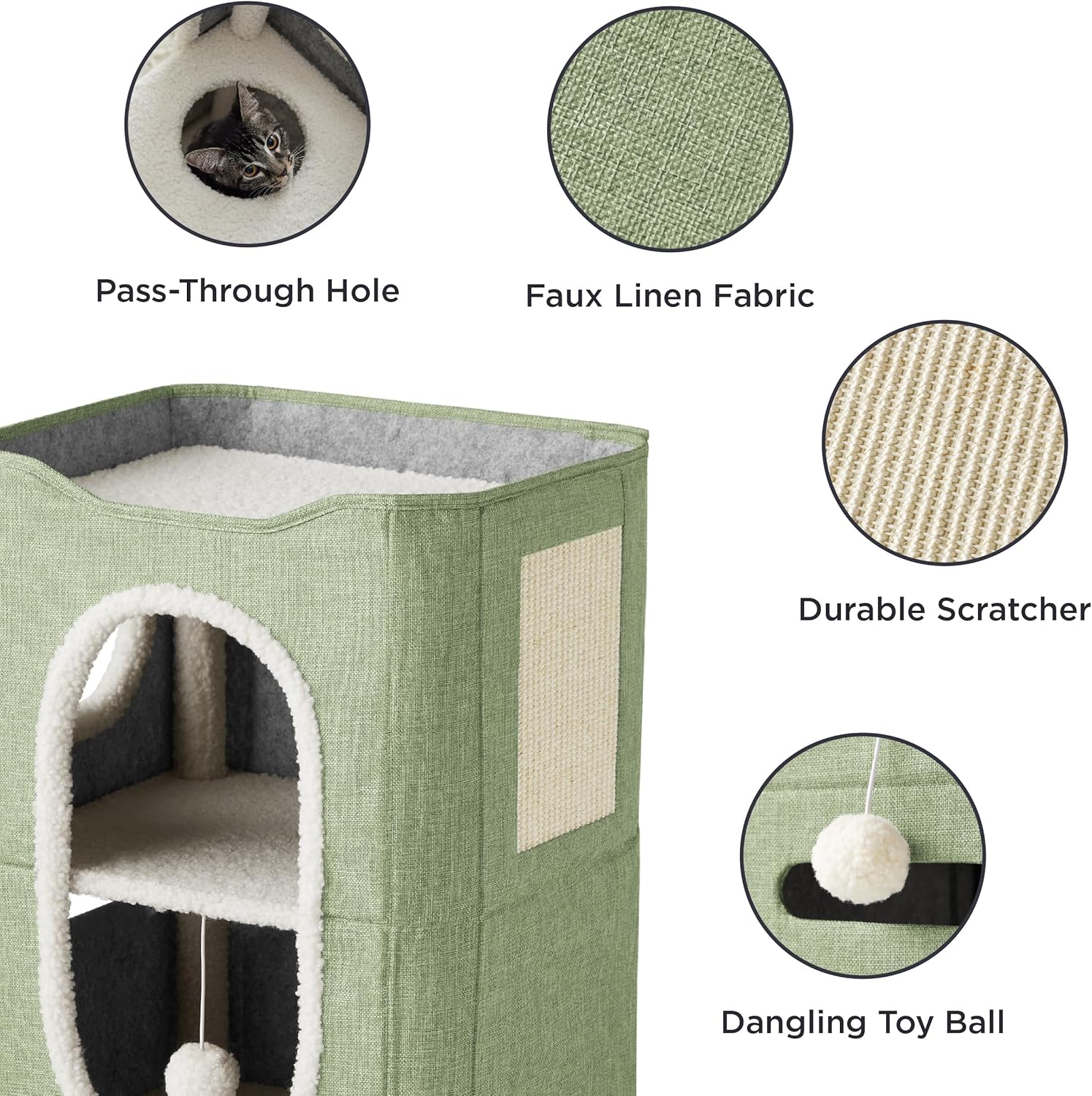 Bedsure 2 Story Cat House - Cat Condos for Indoor Cats with Scratch Pad and Fluffy Ball Hanging, Small Pet Cave Furniture Hideaway for Multi Pets, 18x14x23 inches, Green