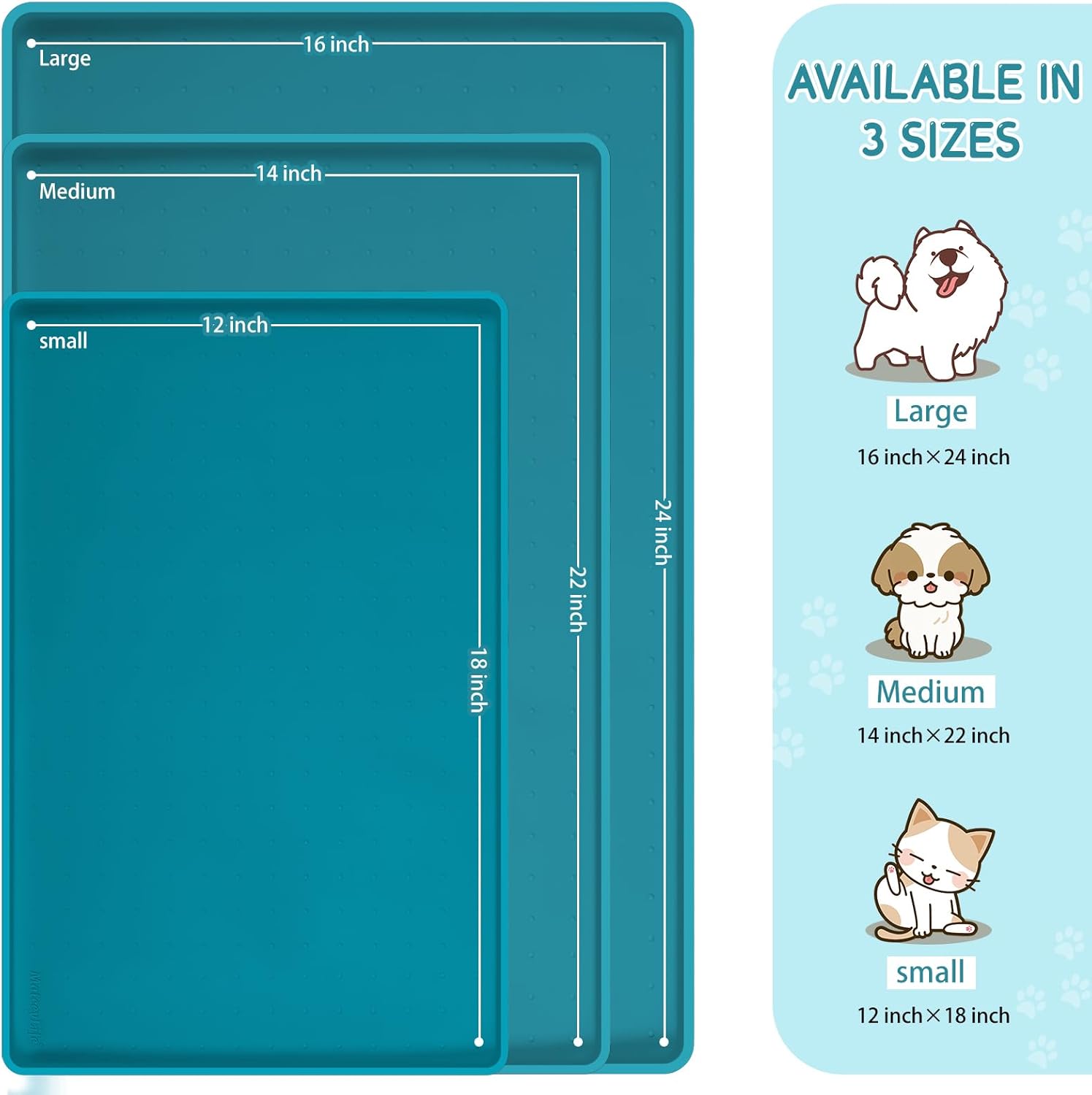- Raised Edge Design: The food mat for cat bowls, dog bowl mats for food and water and boot tray measure 22" x 14" with a 0.6-inch raised edge that helps to keep all the mess contained on the small rubber mat for dog bowls. As a barrier, the waterproof dog mat for food and water, pet feeding mats for dog bowls and cat mats for food and water are perfect for pets who eat with enthusiasm or like to play with their food, effectively preventing pets from eating food that has been soiled by the floor
