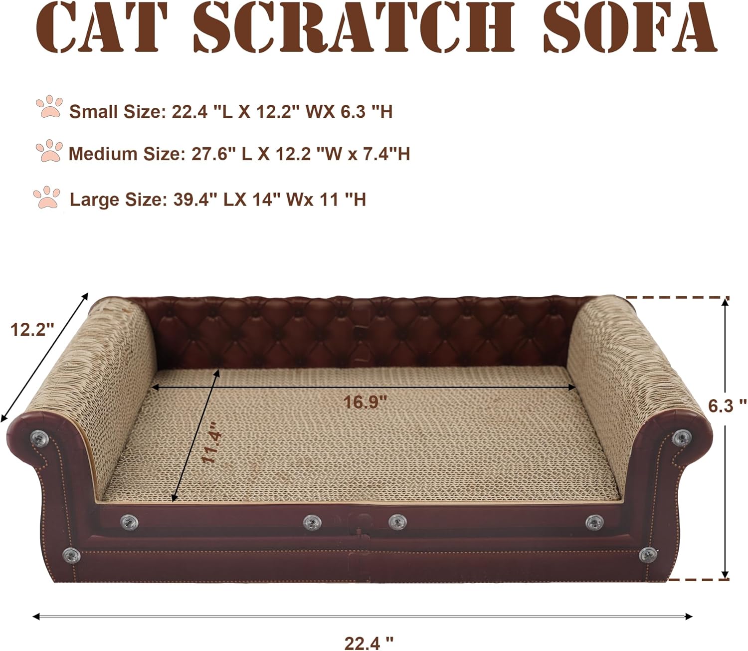 - Cat Scratch Sofa: The sofa cat scratching board is available in a variety of sizes and you can choose the right size for your cat. Dimensions :27.6"L X 12.2"W X 7.4"H. Cat couch bed has a lot of cat space, enough for multiple cats to sleep, play, roll around and scratch.