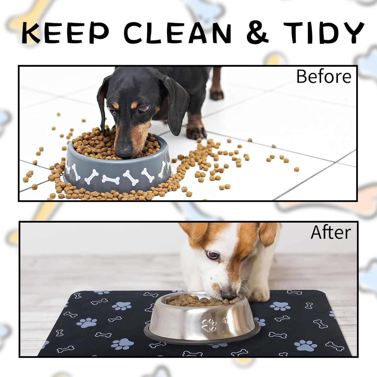 - <b>【Easy Clean】</b>Cleaning our pet food mat is a breeze! Made from a stain-resistant material, simply wipe away any spills or mess with a damp cloth or rinse it under water. This effortless cleaning process helps you maintain a clean and hygienic eating area for your furry friend.