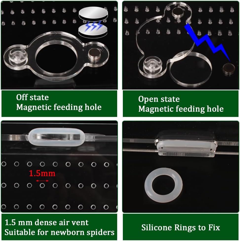 - Unique Design:The tarantula enclosure swivel lock prevents pets from escaping.The top strong magnetic feeding port,convenient for the owner to feed the pet