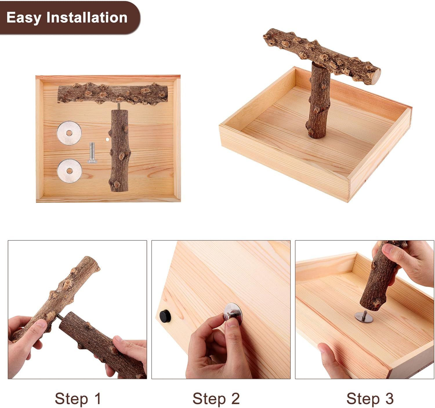 - MATERIAL: This bird stand is made of 100% natural wood and is safe, friendly and durable for birds. The surface of the T-frame is uneven and naturally textured, which is suitable for birds to sharpen their claws and beaks. The T shape bar is attached to the base by metal screws, so it is secure and will not be unsafe for your pet.