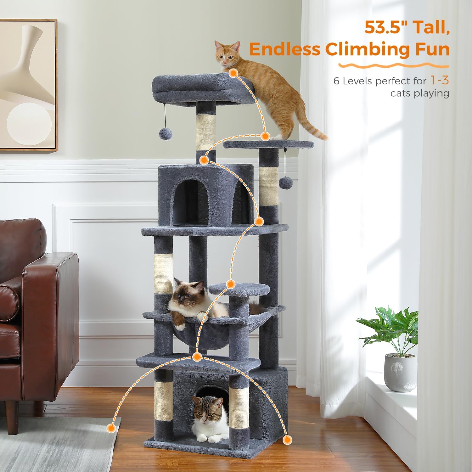 - 53" Tall, Endless Climbing Fun: With the total height of 53.5 inches, the cat tree is perfect for cats who love climbing up and down. Your cats can freely go through the condos, jump to the platform, sleep in the spacious hammock, or climb the post to the top perch. The needs of scratching, climbing, sleeping and exercising could fully be satisfied!
