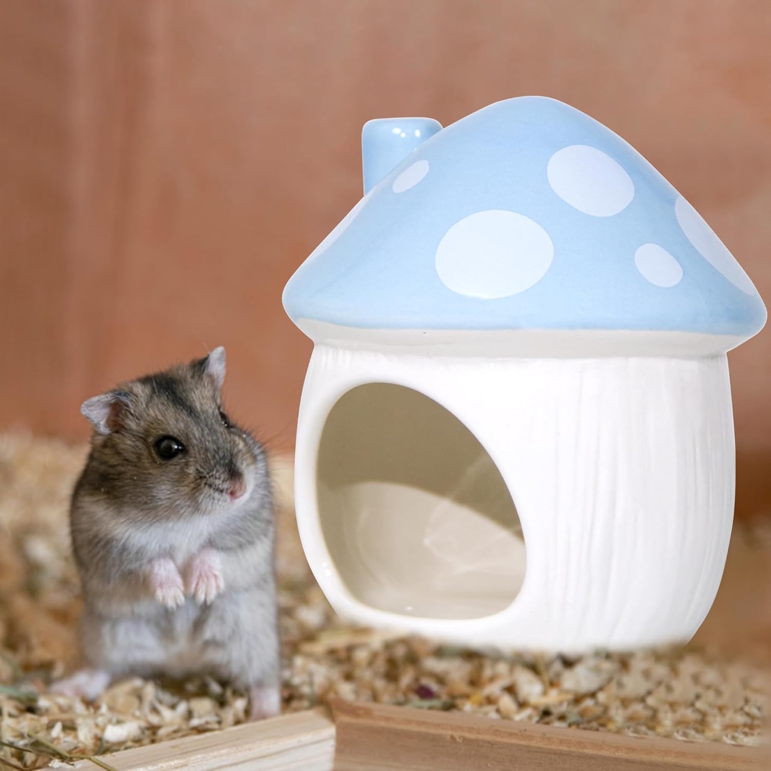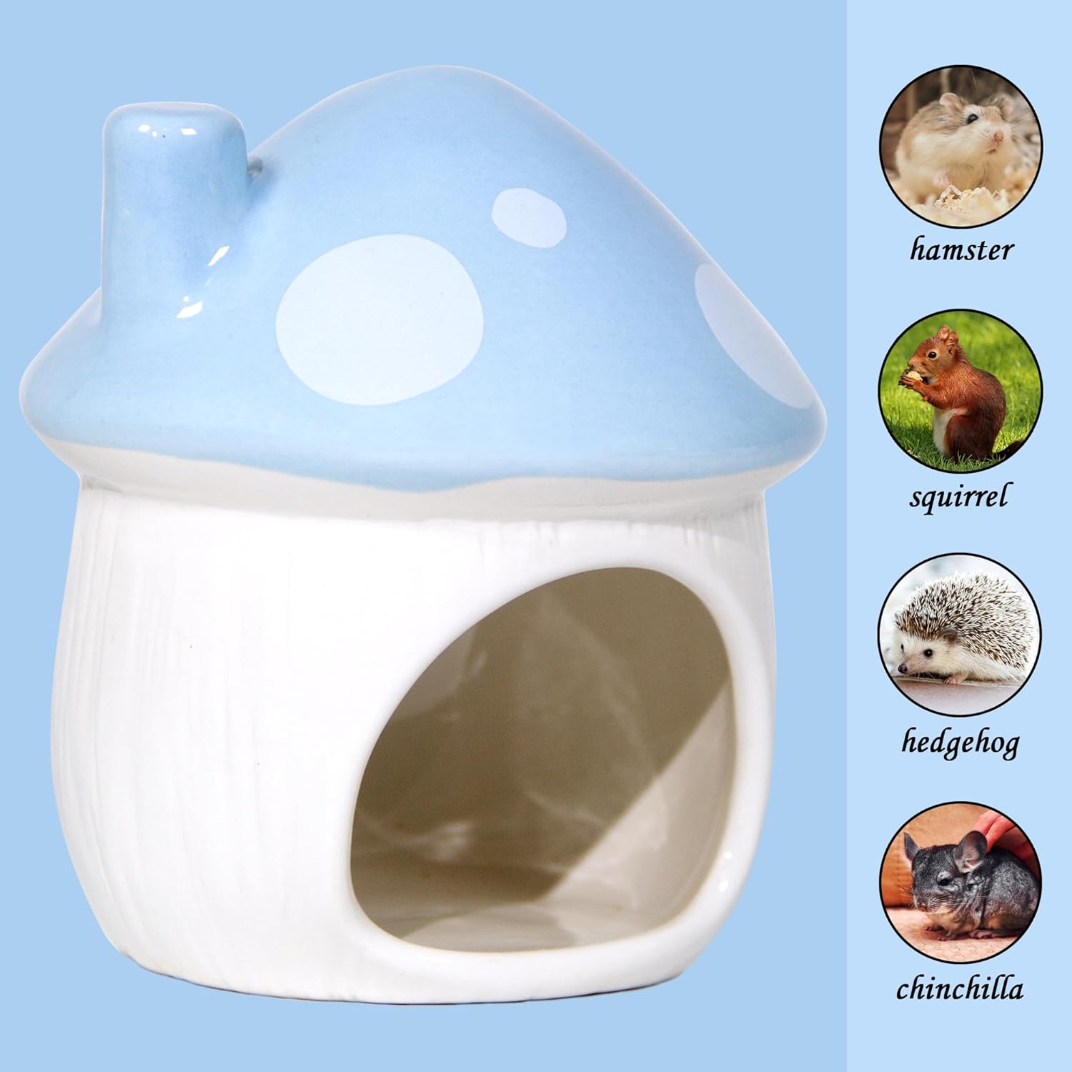 Ceramic Mushroom Hamster Hideout - Hamster Habitat for Hamsters Chinchillas Hedgehogs and Gerbils Mouse Small Pet Guinea Pigs House Hamster Bed (Blue)