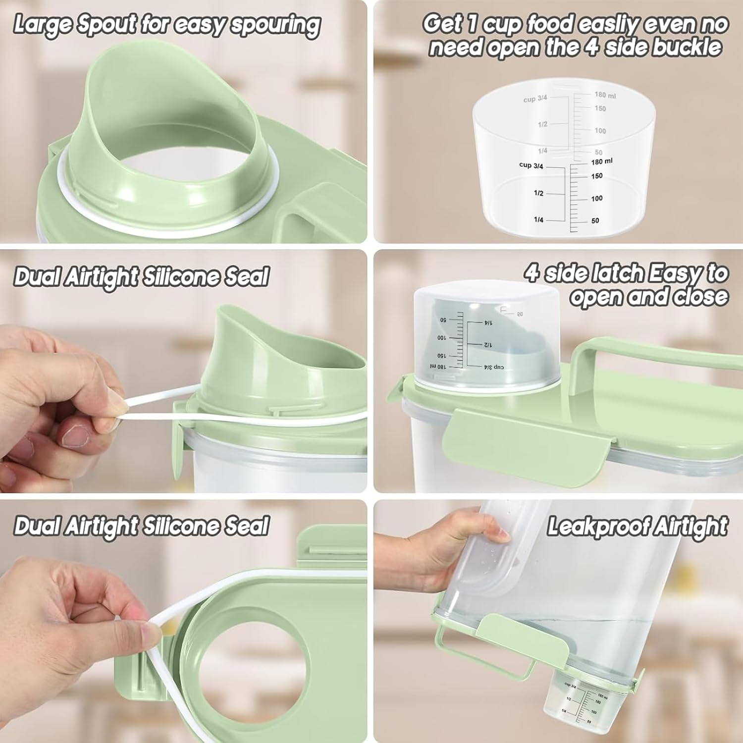 - WHAT YOU GET ? The dog food storage container comes with a 1-pack airtight pet food storage container with a clear measuring cup and an upgraded large spout for easy pouring of pet food at any time. This dog food storage containers can be a gift The perfect gift for any home.