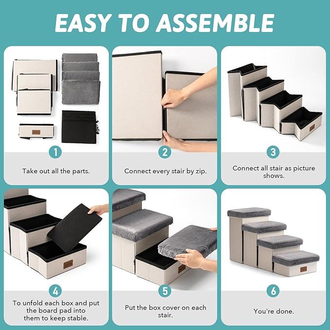 - 【Dog Stairs - Easy to Assemble】First, connect the zipper on each step, then fully unfold each step. Next, place each support board into the corresponding storage box and cover it. When not in use, simply remove the cover and store the stairs after folding them completely. This helps save space, making it ideal for small rooms. You can also watch our installation video in the product description below.