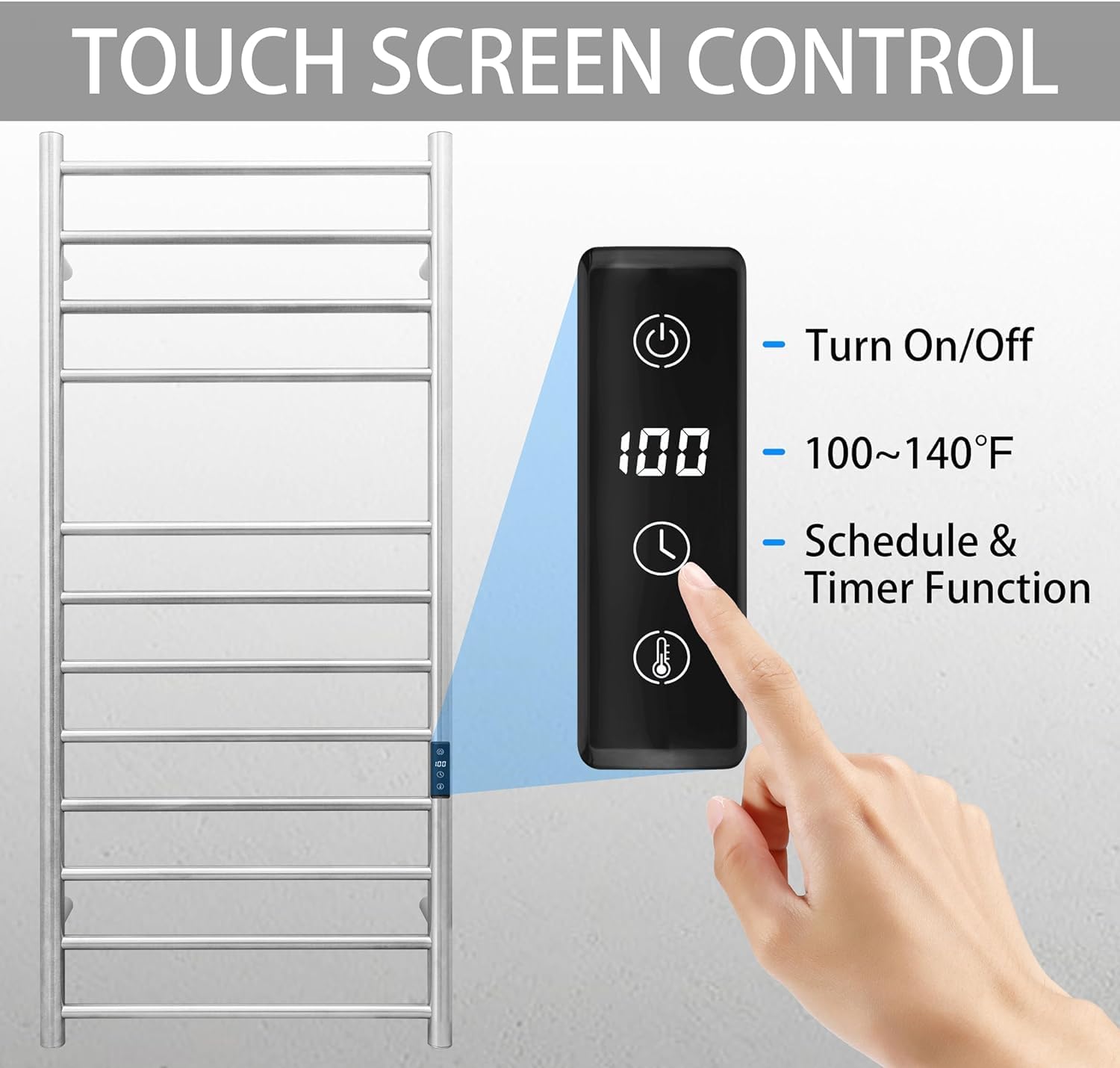 - [TOUGH SCREEN CONTROL]: Manually to turn on/off anytime. Countdown Timer function from 1 hour to 8 hours. Temperature control from 100°F to 140°F.