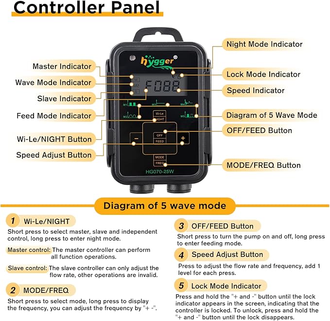 - 🐠INTELLIGENT LED CONTROLLER - With LED display controller, you can set it to different modes to simulate natural living environment 1) 5 wave modes available - pulse wave, sine wave, constant wave, random wave, cross flow wave; 2) 30-100 flow rate levels options; 3) 30-100 frequency levels options; 4) feeding mode; 5) night mode; 6) linkage mode