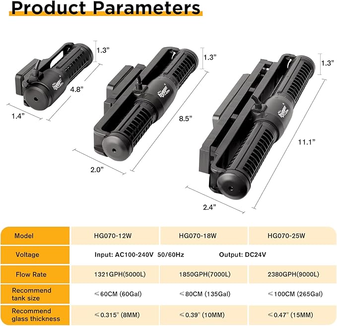 - 🐠SUPER SILENT WAVE MAKER - Safe 24V DC powered controllable wavemaker that uses sine wave control technology to quietly transport circulating water, with almost no sound heard during operation. Its powerful magnetic base allows the pump to be easily and freely positioned, tank thickness up to 1/2"