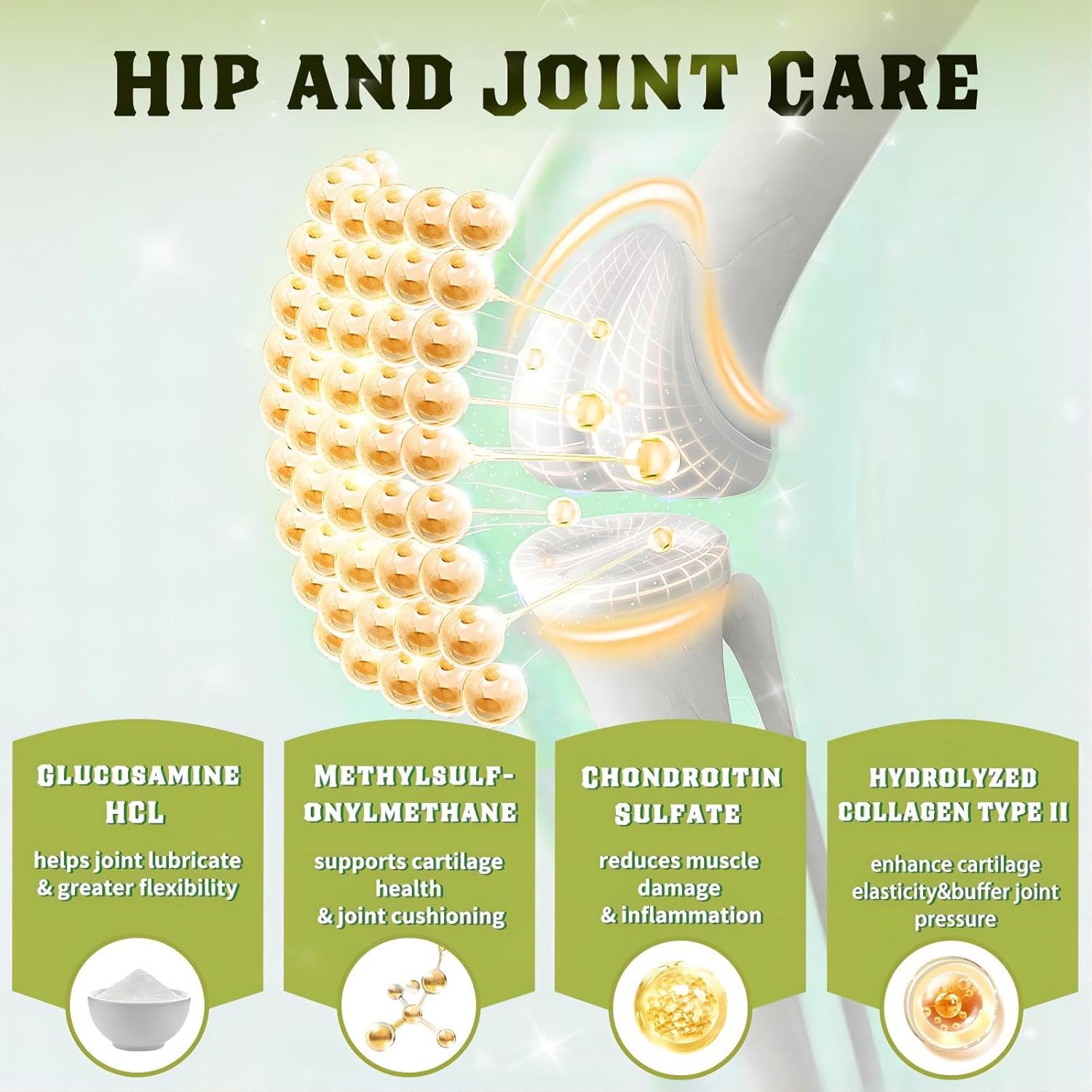 - Anti-inflammatory Blend: DHA & EPA in omega 3 for dogs and Turmeric block the production of inflammatory molecules. Yucca slow recovery of joint pain and stiffness. Dog glucosamine also adds other three anti-inflammatory ingredients, hyaluronic acid, boswellia serrata and green-lipped mussels, creating a high-concentration blend of potent anti-inflammatory and joint-strengthening ingredients. Dog joint supplement help reduce stiff joints, joint damage, and hip dysplasia.