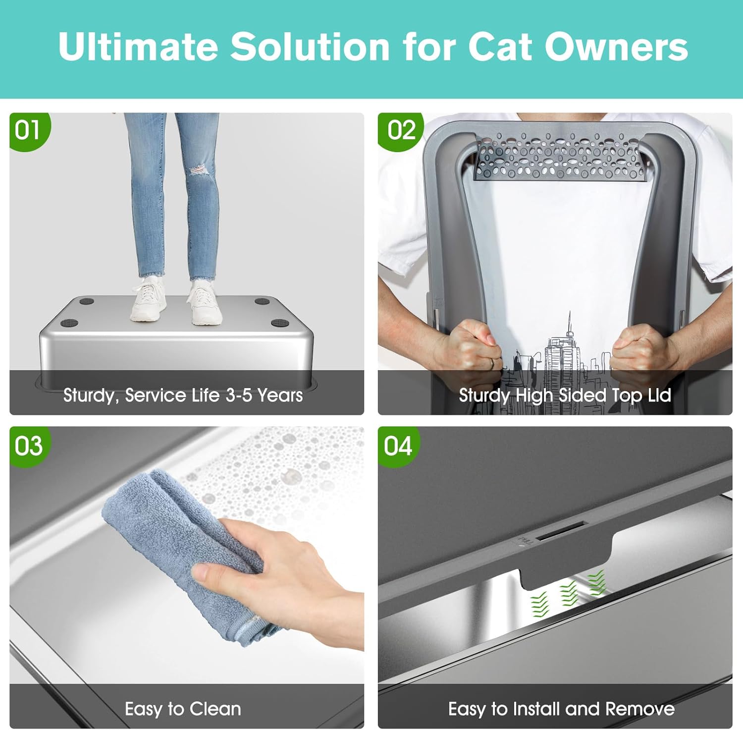 - 【Non Sticky, Odor Free Steel Cat Litter Box】: Unlike plastic alternatives, the stainless steel material does not absorb stains or odors.Its smooth, non-sticky bottom makes it very easy to clean, and these make it easy for you to maintain a fresh and clean environment for your beloved cat. This feature alone makes it a standout choice for cat owner who prioritize cleanliness like you.