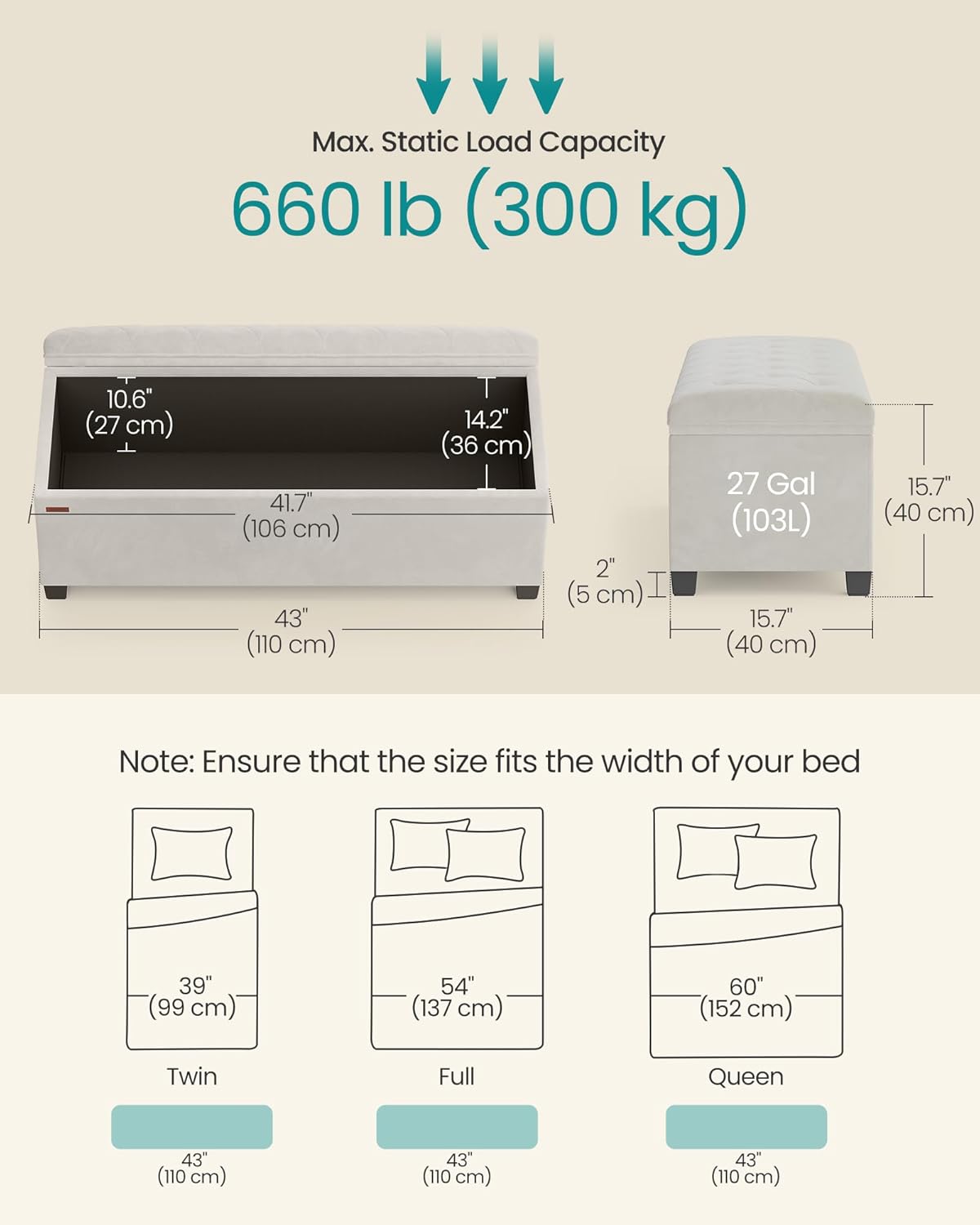 - 【SPACIOUS STORAGE】Sized at 15.7"D x 43"W x 15.7"H (40 x 110 x 40 cm), this bench offers a 27-gallon (103 L) volume for your blankets, books, and bed sheets