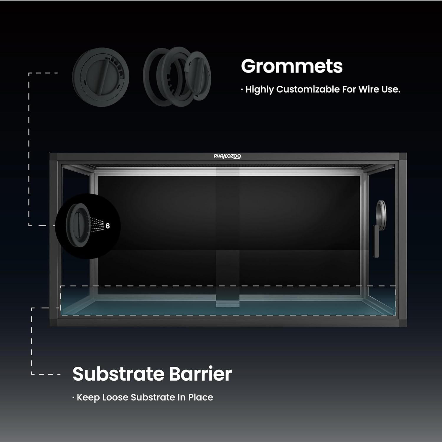 - 【Easy Maintenance】Front opening reptile terrarium with door handles included for easy cleaning & feeding. No more suction cup problems or unsightly fingerprints all over. The substrate barrier keeps the substrate in place. Our tempered glass doors are durable enough to withstand scratching.