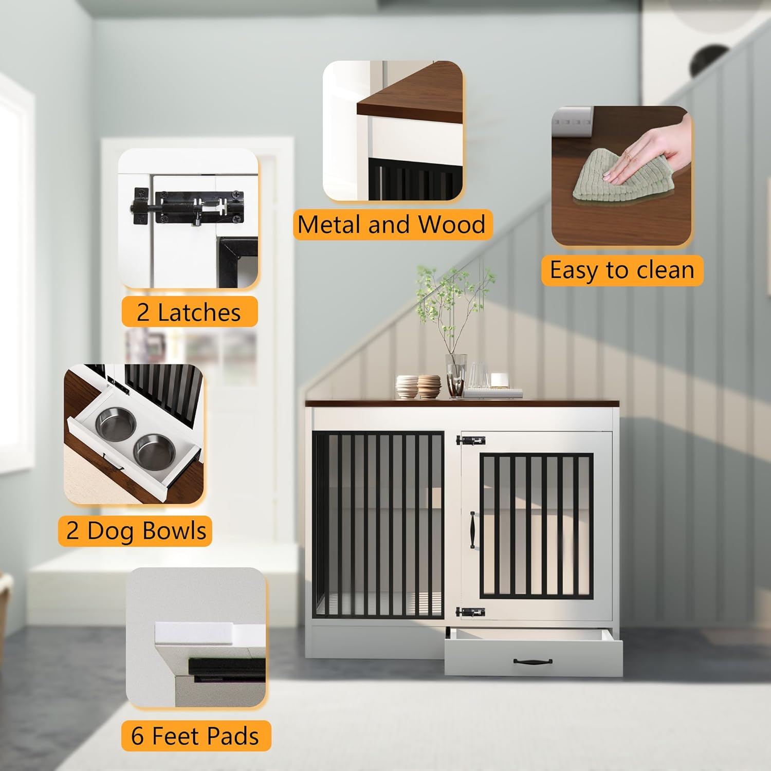 White Heavy Duty Furniture Dog Crate, Wood and Metal Kennel Cage, Pet House End Table with Drawer and Pull-Out Design, Dog Home for Indoor use, Large Size