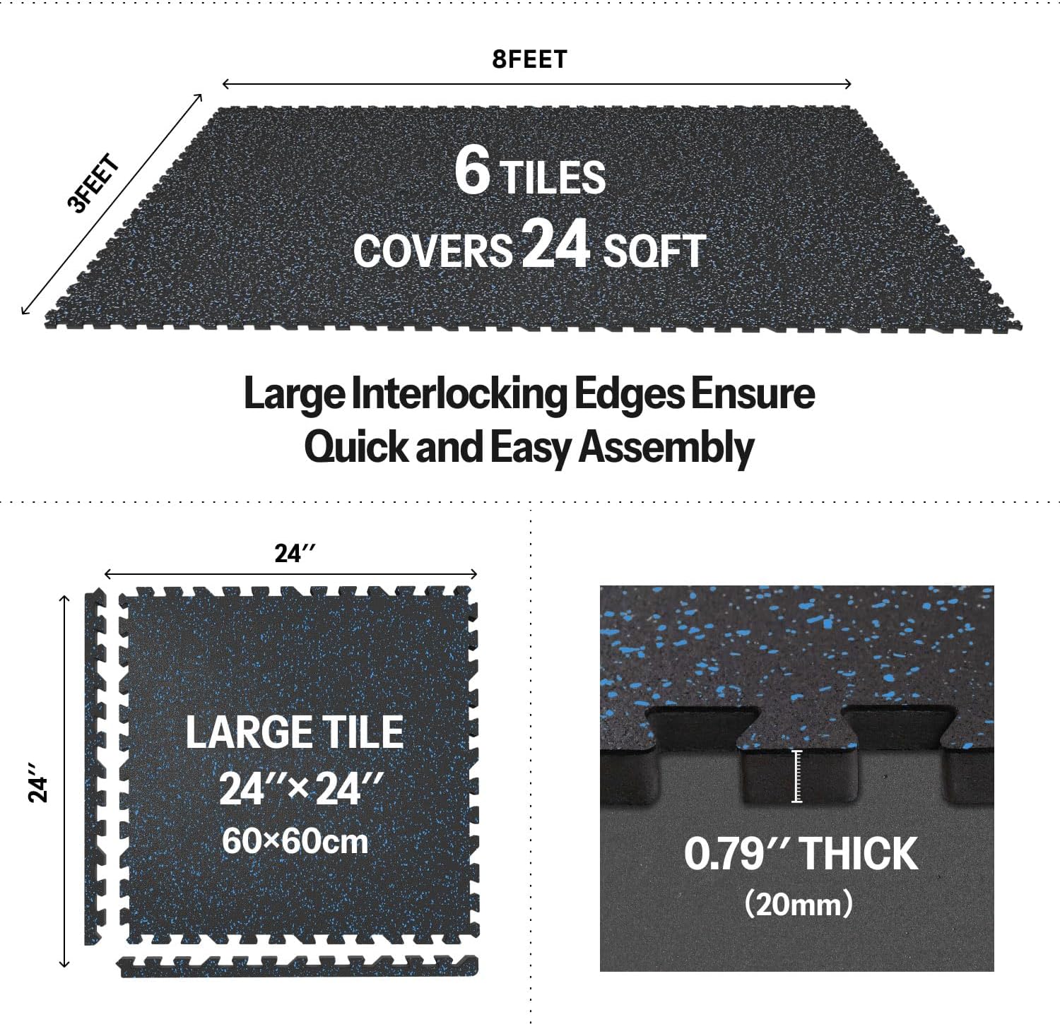 - [Easy to Assemble and Detach]: 6 tiles (24" x 24" x 0.79" each), covers 24 sq ft (6 × 4 ft). Upgraded larger interlocking locks provide a secure fit, preventing any separation during use, ensuring you can work out without concerns of shifting. Simple assembly and detachment make it effortless to set up your home gym.