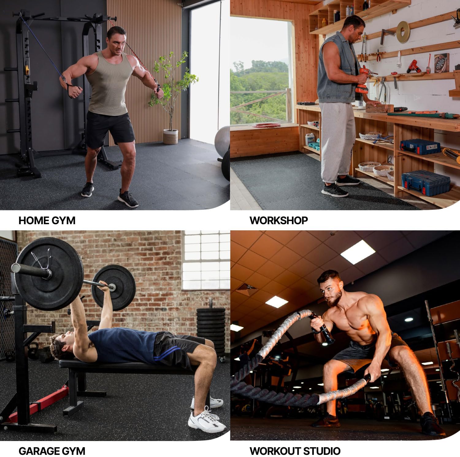 - [Upgraded Dual-Layer Design]: Concerned about your equipment scratching the floor during workouts? Our 2in1 Rubber Top EVA Foam Exercise Gym Mats are crafted to solve this issue. The textured rubber top layer, combined with a high-density EVA foam bottom layer, seamlessly creates a non-slip tough surface with excellent shock absorption.