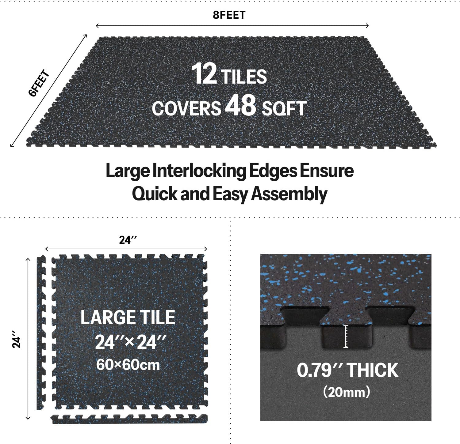 - [Easy to Assemble and Detach]: 12 tiles (24" x 24" x 0.79" each), covers 48 sq ft (8 × 6 ft). Upgraded larger interlocking locks provide a secure fit, preventing any separation during use, ensuring you can work out without concerns of shifting. Simple assembly and detachment make it effortless to set up your home gym.
