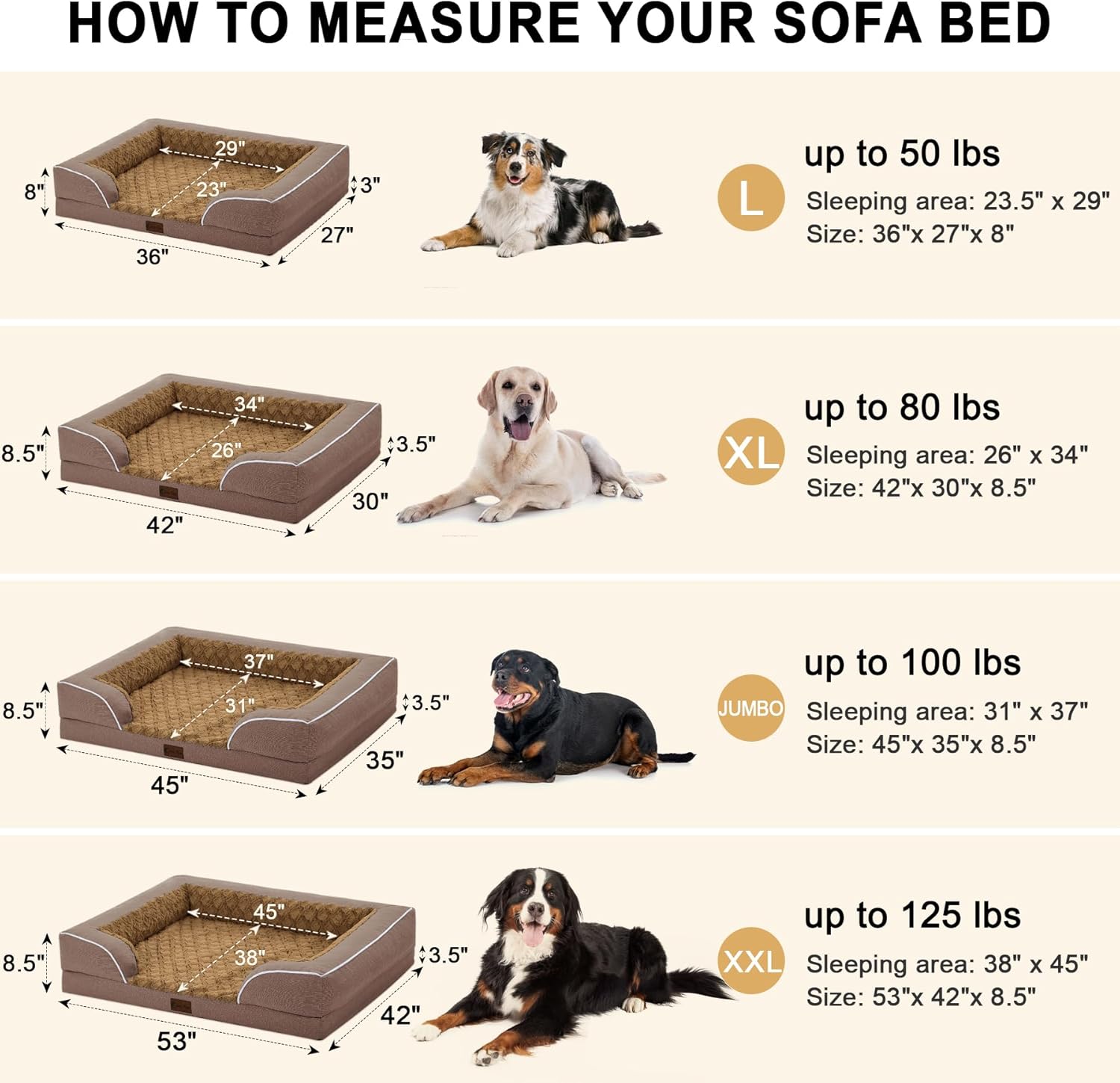 - DOG SOFA SIZE: XX-Large dog bed 53" x 42" x 8.5" (3.5" Base+5" Bolster; Sleep Surface: 38" x 45") for pets up to 125 lbs. Due to the dog couch bed arrives as a vacuum-packed bed in a box, please unpack and leave in air for about 48 hours, the dog bed will spring back and fill up.