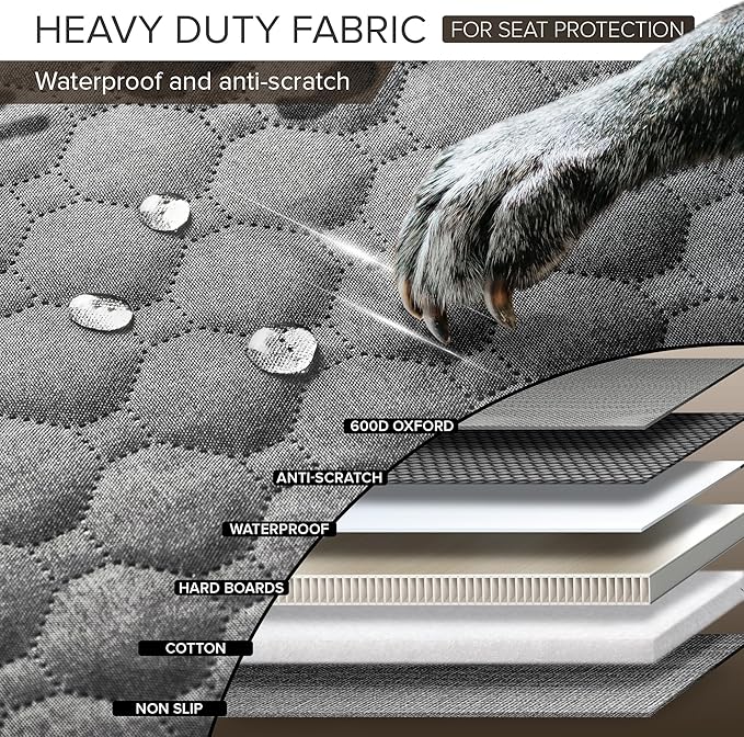 - HEAVY DUTY DOG CAR BED TO ALL-ROUND PROTECTION - The waterproof back seat cover made of 6-layer fabrics, including strong 600D Oxford, dog car seat cover hard bottom and special fabric for scratch-resistant, safeguarding car seats from wear, water and stains. Backseat cover for dogs in car with extra higher door protector avoid doors from scratches and damage. Let dogs hop in and out the dog hammock bed with joy, while car seat covers for dogs takes care of preserving your car perfectly