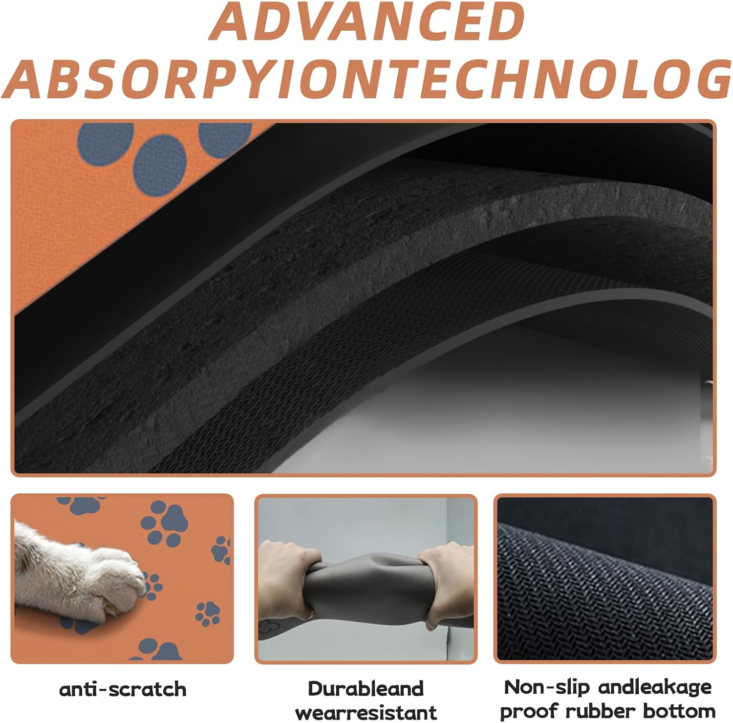 18"×30" Dog Food Mat-Absorbent Dog Mat for Food and Water, No Stains Quick Dry Cat Dog Food Bowl Mat Non Skid Dog Feeding Mat with Footprints for Messy Drinkers Orange