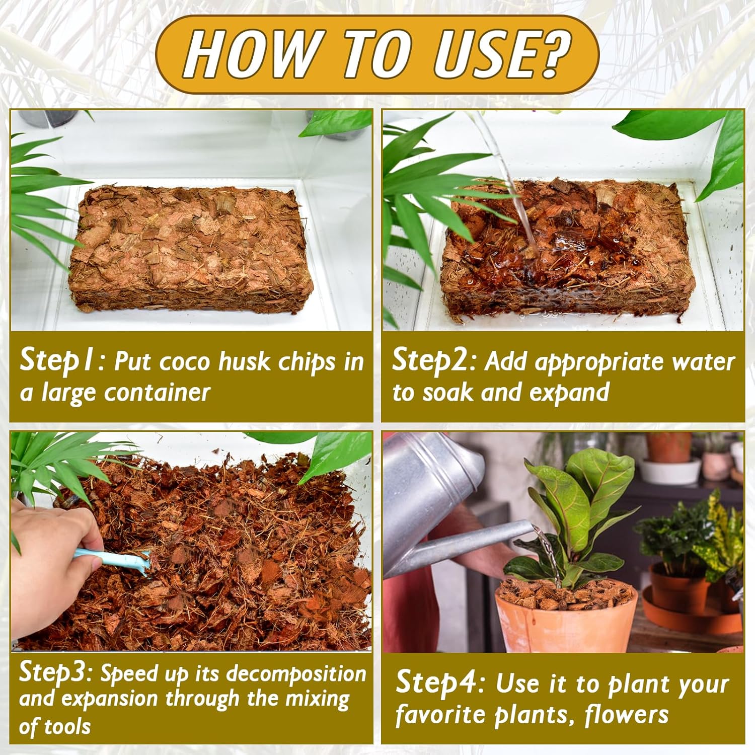 - ๐๐๐ฌ๐ฒ ๐ญ๐จ ๐๐ฌ๐ ๐๐ง๐ ๐๐ญ๐จ๐ซ๐: Our compressed coco bark is very easy to use and carry around. All you need to do is put them in a large container and soak them with the right amount of water to swell into loose coco chips to provide the best substrate for all types of plants