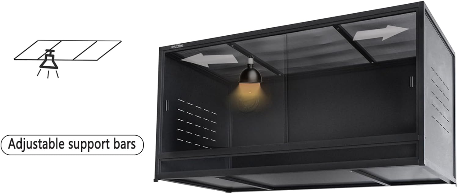- 【Heat Humidity Retention and Top Ventilation】: The side panels of ToxiRium Reptile Terrarium are made of PVC material, which helps keep heat and humidity. The top screen mesh provides great ventilation, and two crossbars can be moved in parallel, enabling you to adjust the position of the hanging heating light or UVB reptile lamp. 1 cm raised bottom to facilitate the mounting of a reptile substrate heater