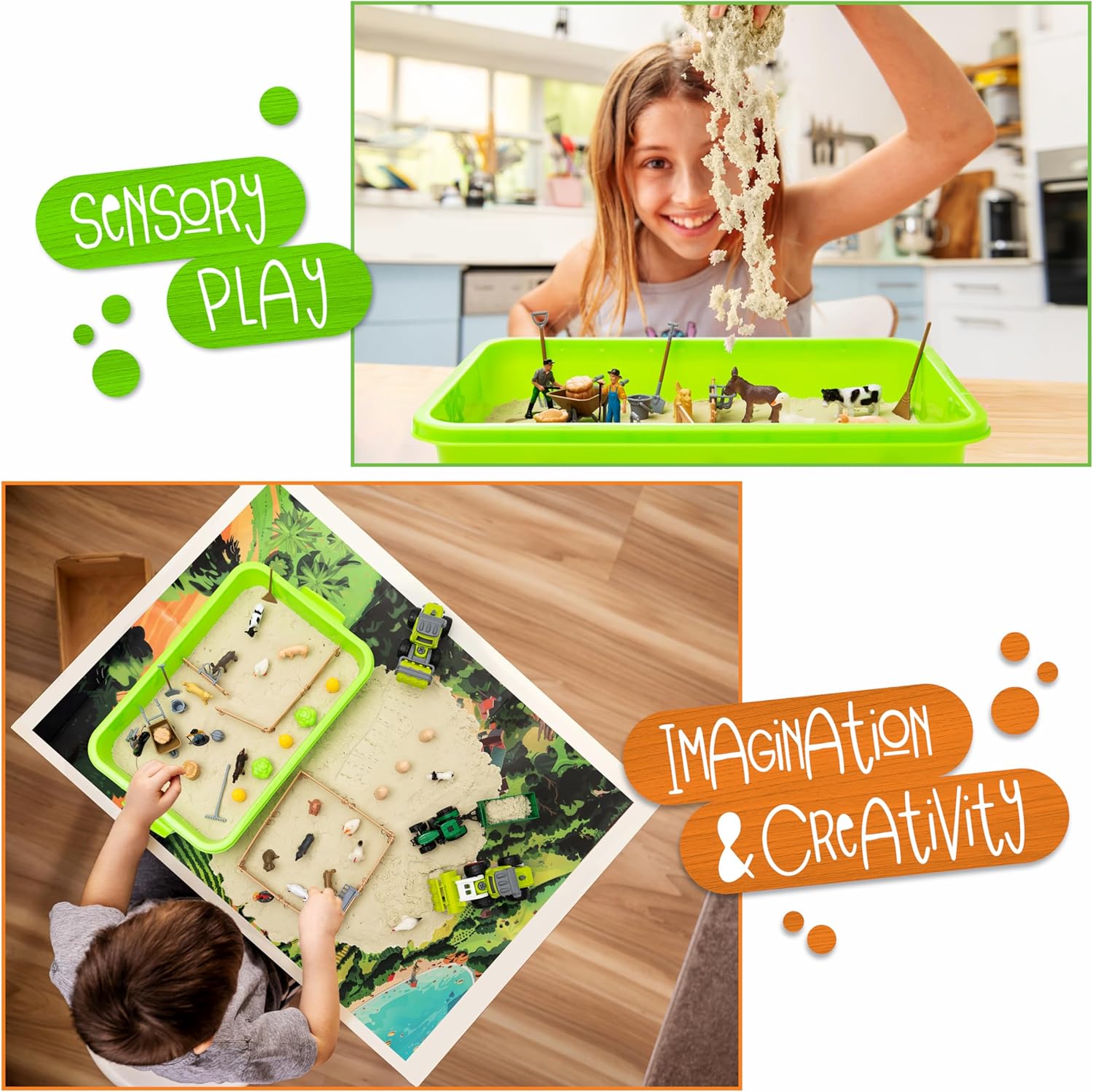 - MESS- FREE MAGIC SAND FUN: Say goodbye to messy playtimes! Our farm sensory bins come with 2.4 lbs of self-sticking, reusable magic sand that molds like a dream. The included sandbox with cover keeps everything tidy, making it a fantastic choice for toddler sensory toys and preschool toys alike. Creative construction toys have never been this clean!