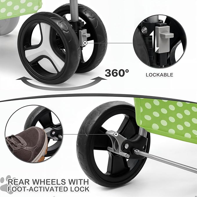 MoNiBloom 3 Wheels Pet Dog Cat Stroller for Small Medium Dogs Cats, Foldable Jogger Stroller w/Storage Basket and Cup Holder, Lawn Green Polka Dots