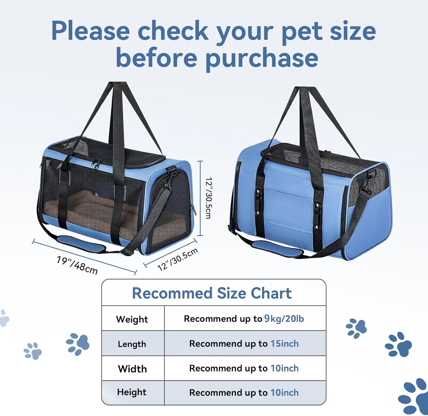 PETSFIT Soft-Sided Cat Carriers & Car Seats with Patent Safe Buckles, Clip-On Harness, 19"x12"x12" Pet Travel Carrier - 20 lbs Capacity (Blue)