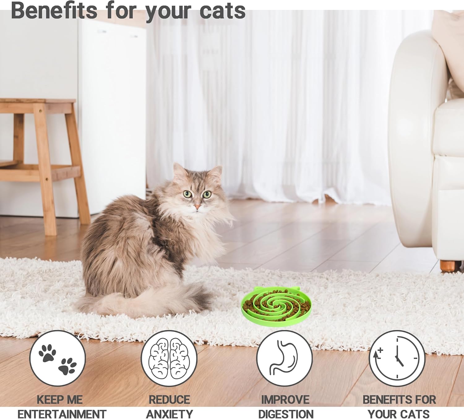 - Fun Slow Feed Bowl: The spiral pattern in our feeding bowl makes cats work for their food, as they need to navigate the curved channels to reach their meal. This design naturally slows down their eating pace, promoting better digestion while providing a more relaxed dining experience