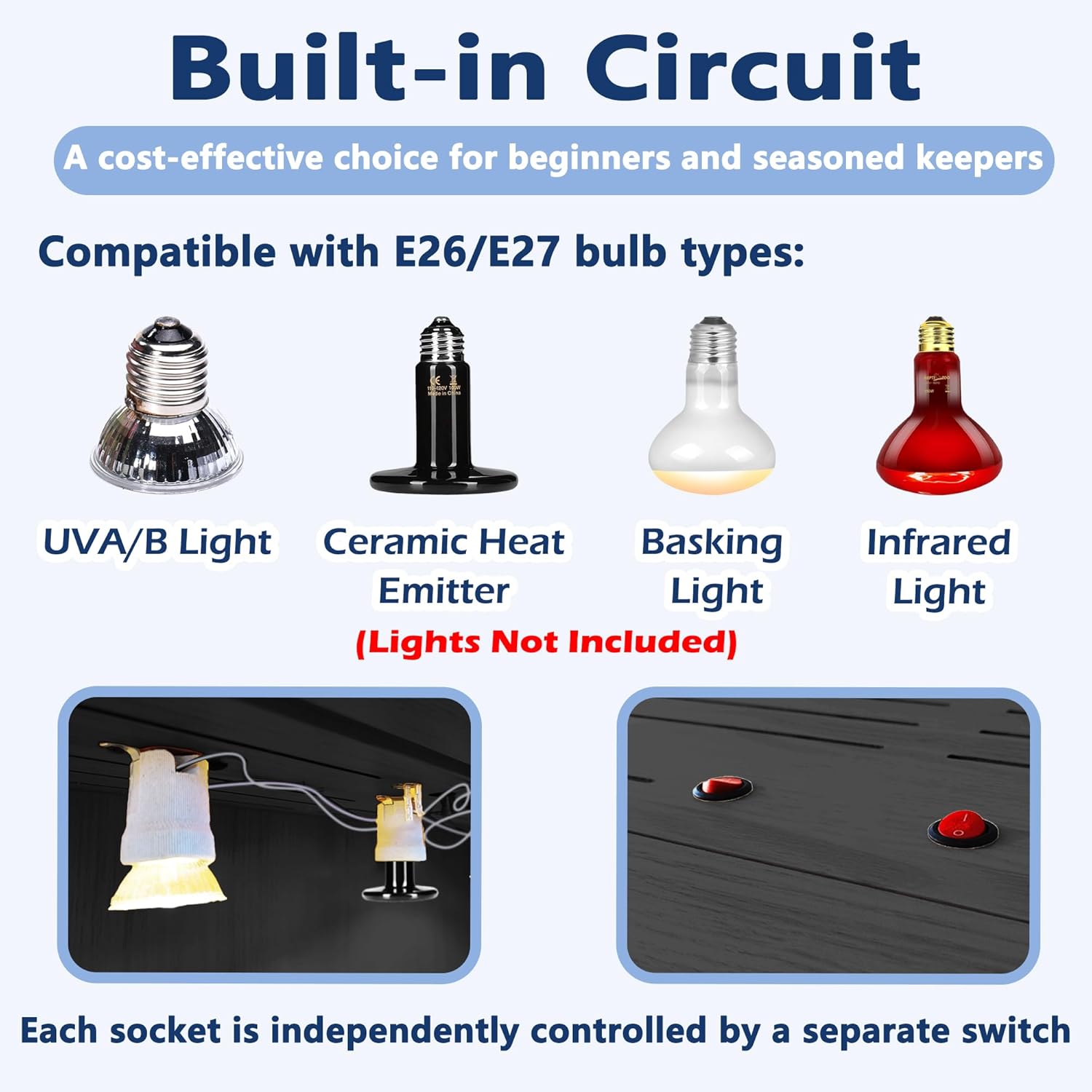 - 【Integrated Bulb Sockets】Take the hassle out of lighting with built-in bulb sockets and switches. Feature two (the larger 40-inch and 48-inch models feature 3) sockets compatible with E26/E27 bulbs (bulbs not included), supporting heating, daylight, and night lighting needs. Simple to install, these pre-installed sockets saves money on lamps and make it effortless to create the ideal environment for your reptiles.
