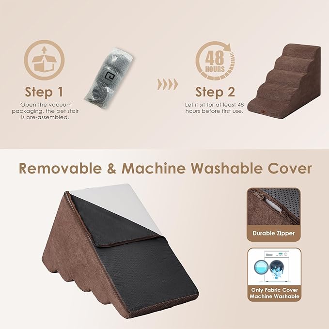 - SPECIFIC AND STEADY DESIGN - 33D density of pure foam make this stair more steady when your pets walk on. The dog bed stairs can provide strong support for pets in the walking process. Low angle slope design can better protect your pet's joints.