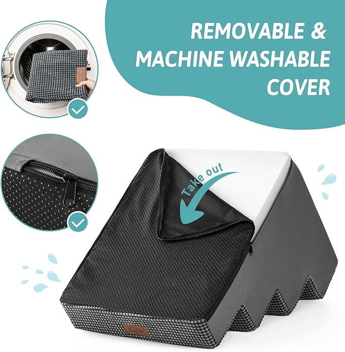 - Non-Slip Base and Removable Cover: Our dog steps for beds are equipped with a non-slip base featuring rubber dots for extra grip, minimizing movement during use. The pet steps cover is waterproof inner side, so you don’t have to worry about stains seeping into the foam. The outer cover is removable and machine washable for easy cleaning