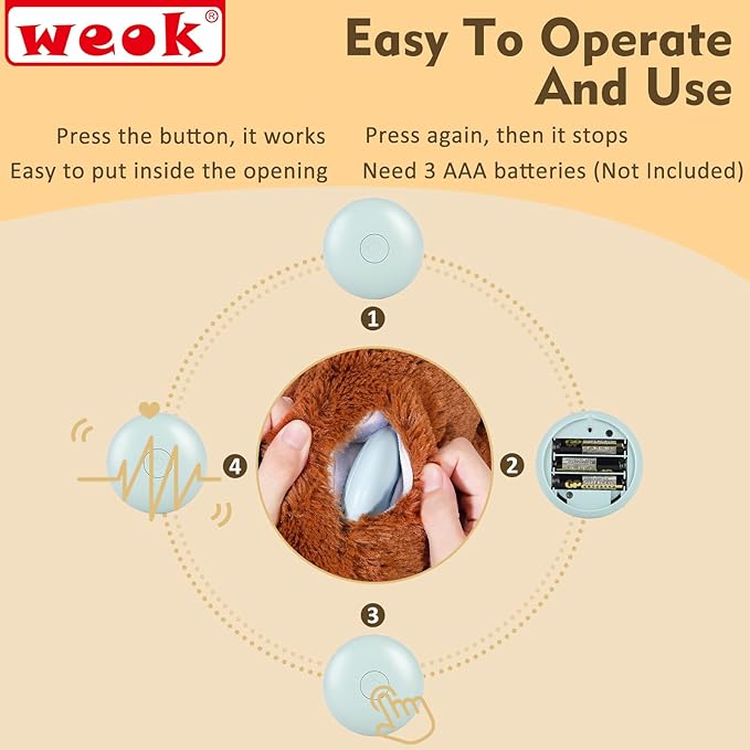 - 【Heartbeat Simulator Module + Plush Toy】The WEOK product contain a plush dog toy and a heartbeat simulator Module. The heartbeat Simulator need 3 AAA batteries(No battery included in the package). Press the button, then the heartbeat module works. Easy to operate.