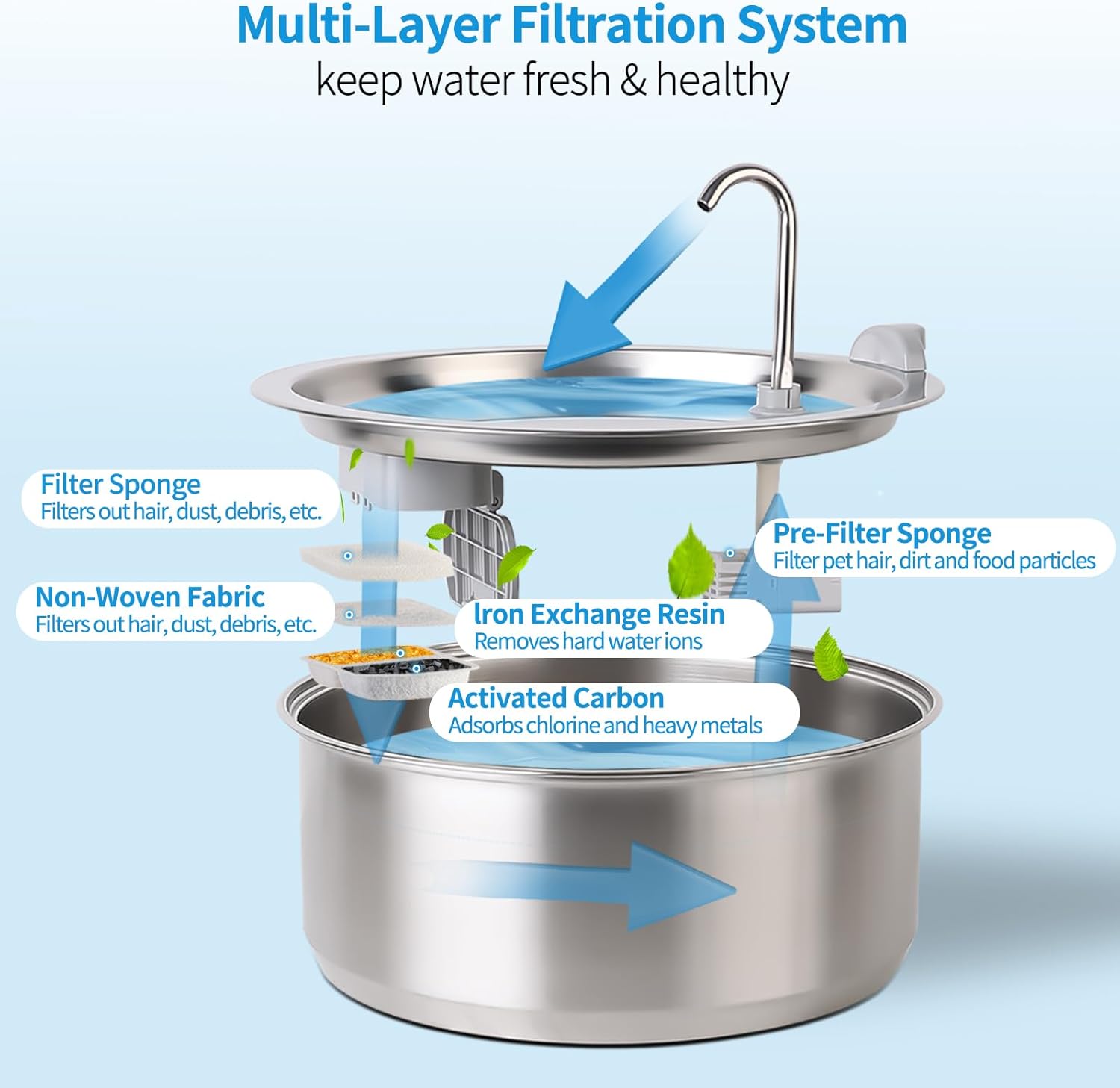 - Muti-Layer Efficient Filtration:The sponge in the filtration system can filter hair, ion exchange resin can soften tap water, and activated carbon can remove odors.