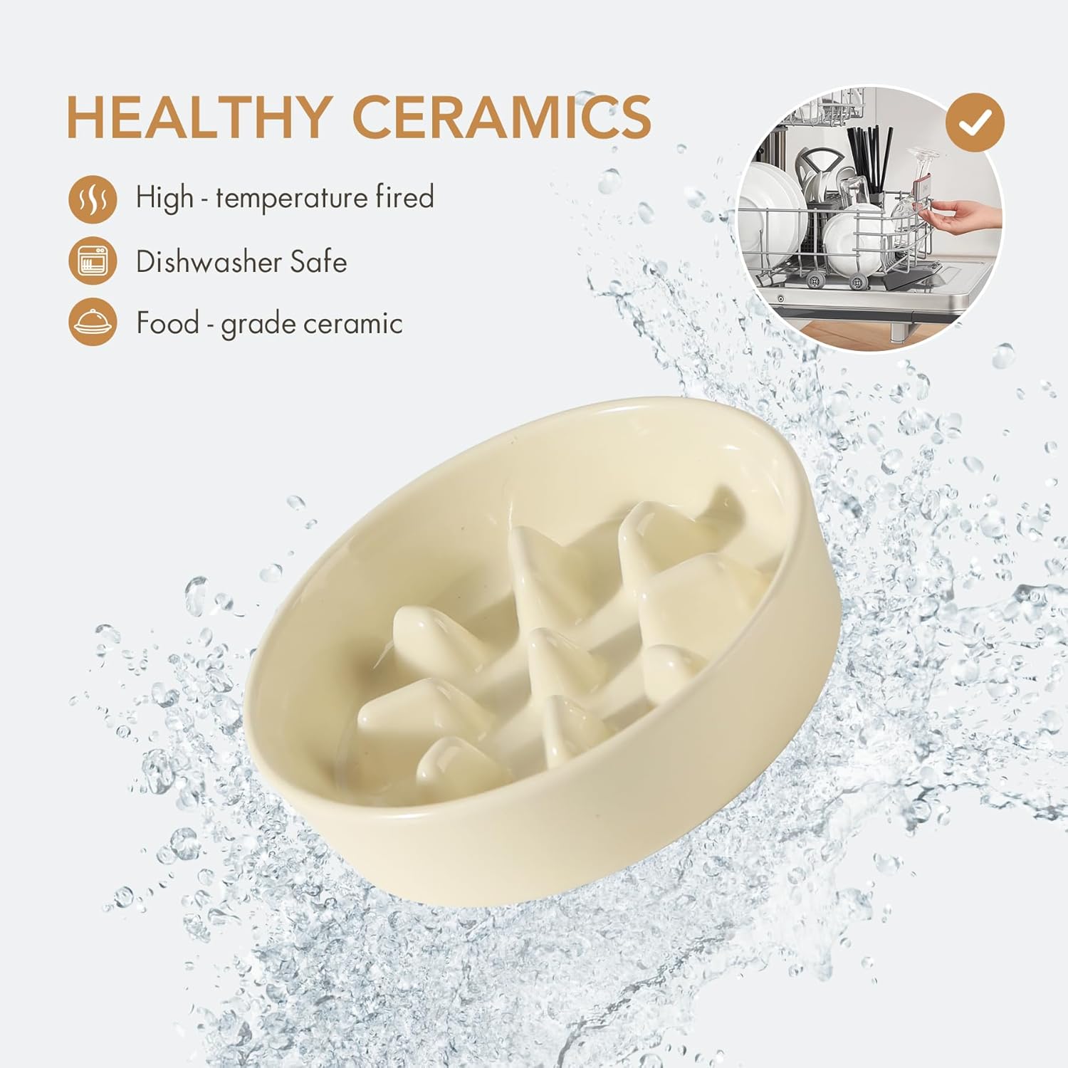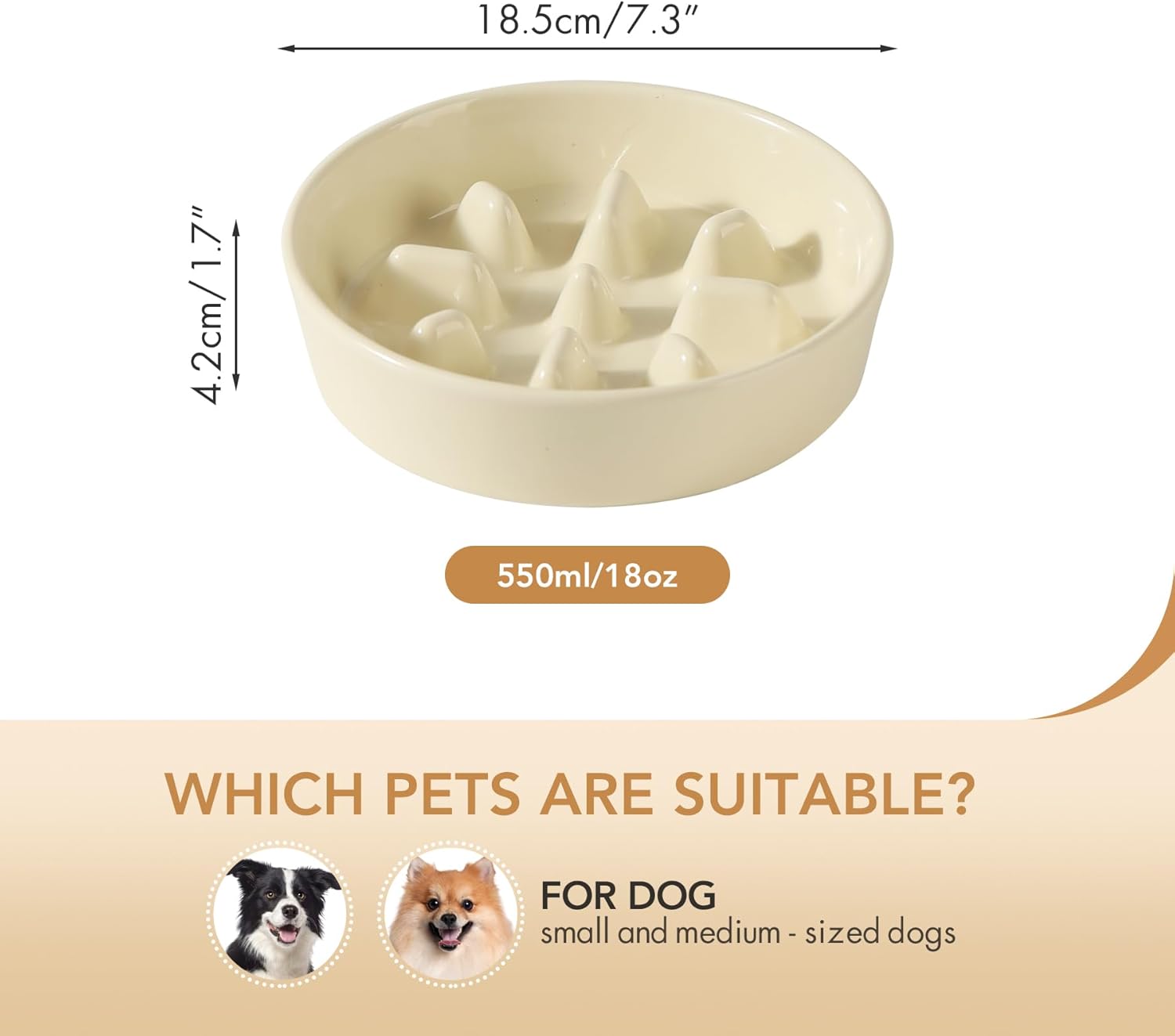 Ceramic 7.3 inch Dog Bowl Slow Feeder, Slow Pet Food Dish for Medium and Small Dog, Stop Bloat, Preventing Choking(Single Bowl, Beige)